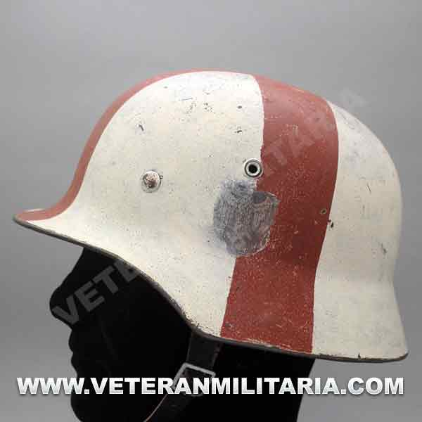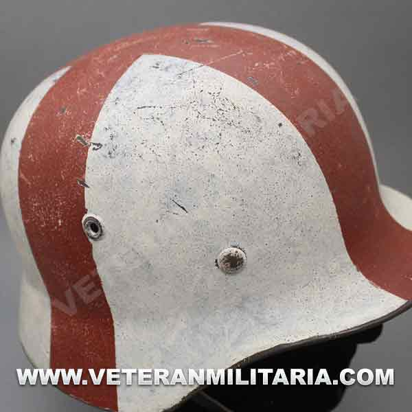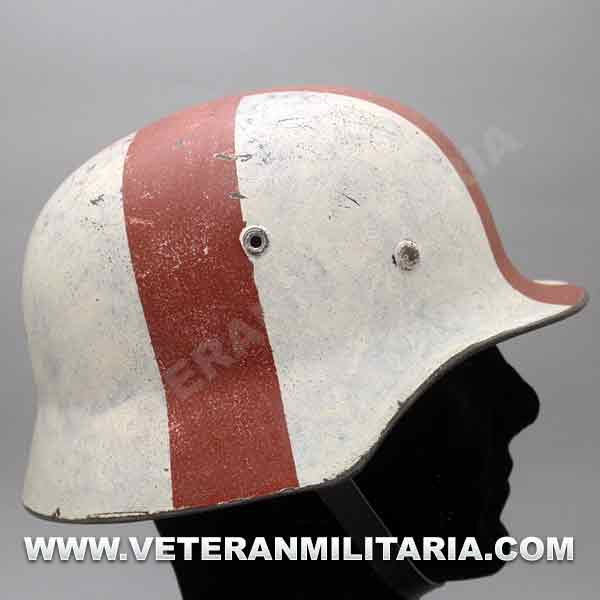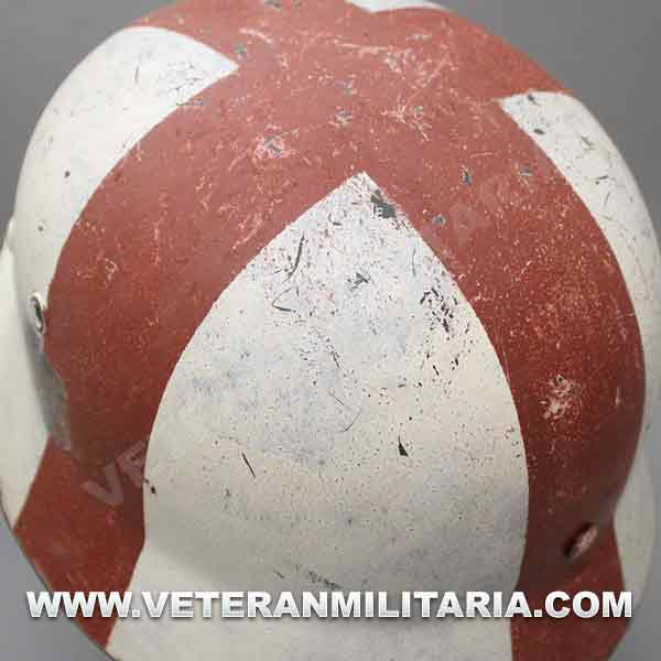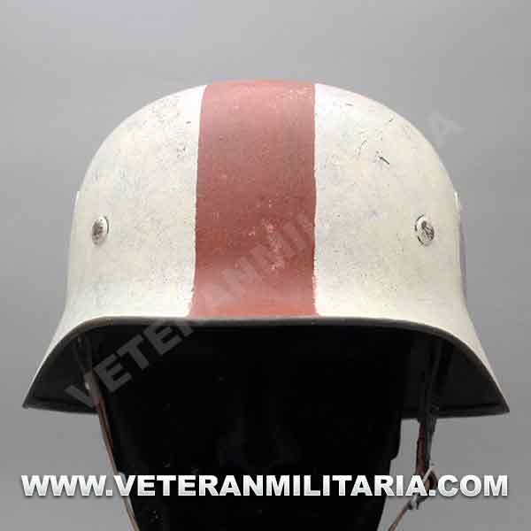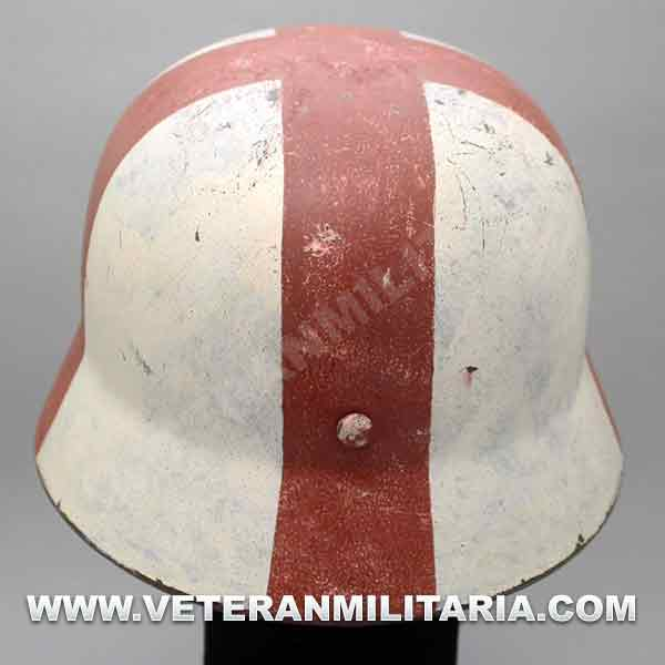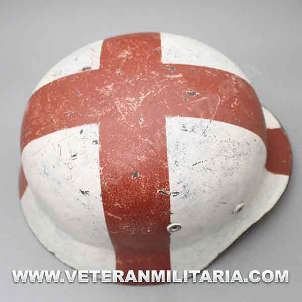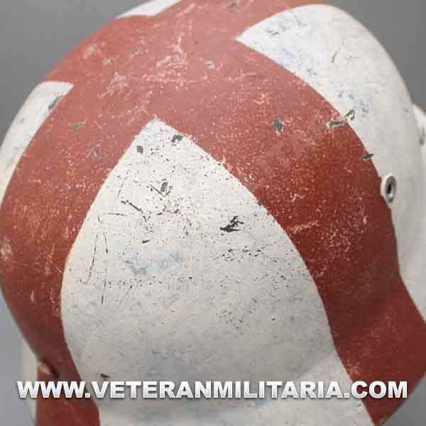 Reproducción de casco M40 de sanitario de la Wehrmacht, una calca, pintura blanca y roja envejecida, fabricado en acero, completo con interior y barboquejo, Marcajes de fabricante.