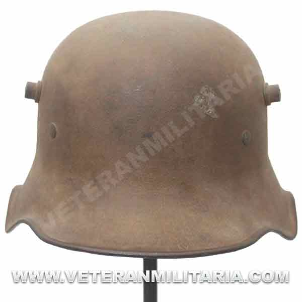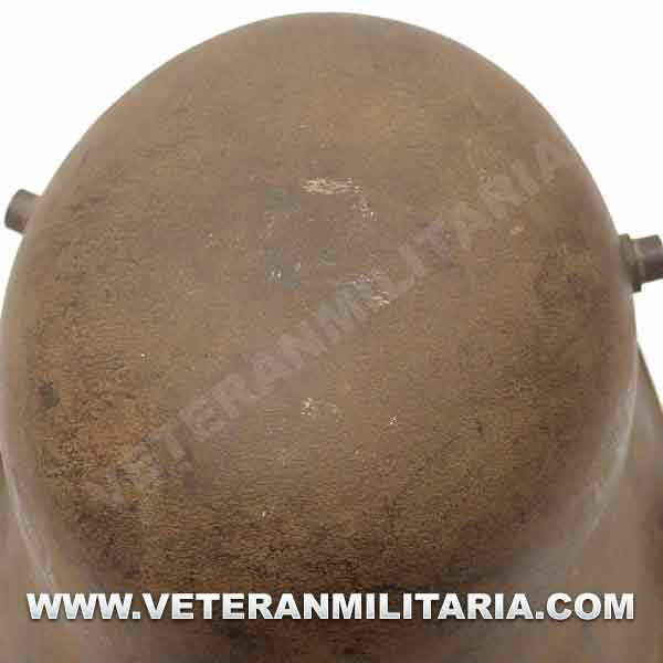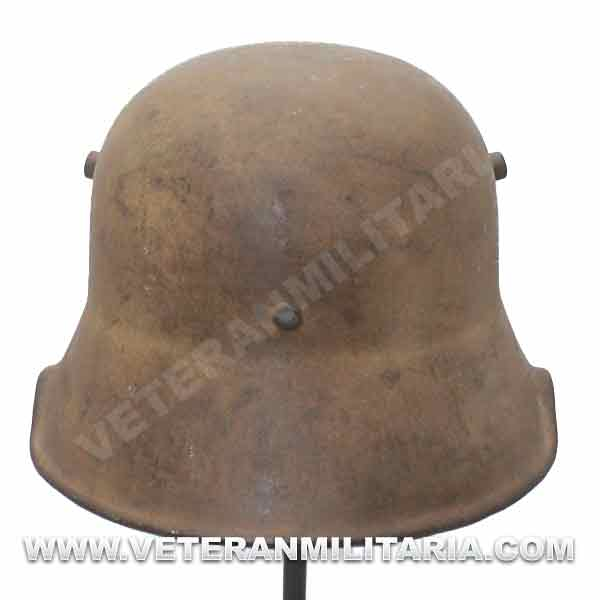 Casco alemán modelo M18 con recortes para las orejas, la denominación del casco "Fernsprecherhelm" y que fue introducido a título experimental en agosto de 1918. El casco tiene pintura original (Wollstaub -polvo de lana), gris de campaña, pero con el tiempo tienden a adquirir una pátina marrón debido a la oxidación, marcajes ET64 en la sección interior del faldón, los números de lote están estampados en la parte superior DB559R, interior completo, la tela tiene pequeñas fisuras, la piel de barboquejo esta un poco reseca.