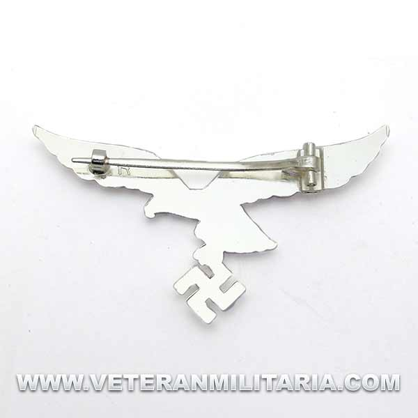 Reproducción de águila de pecho en metal para oficiales de la Luftwaffe, fabricada en metal de color plateado. En reverso cierre de alfiler, marcajes de fabricante.