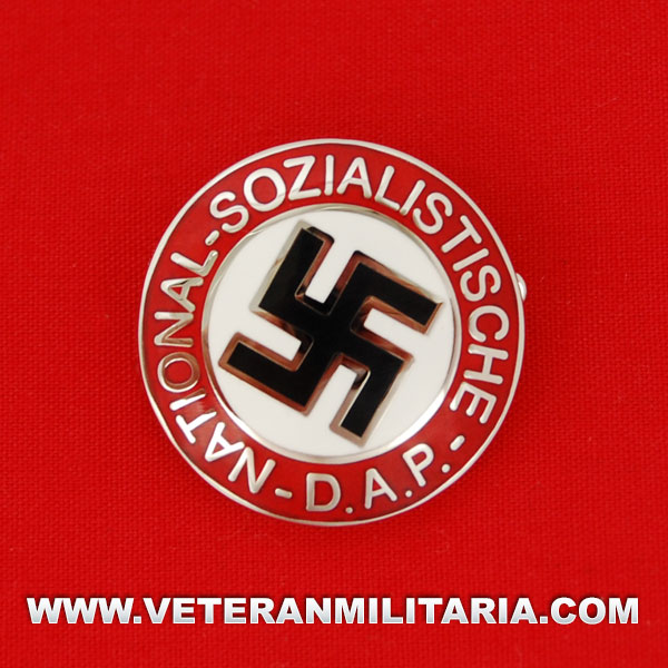 Reproducción del distintivo del partido nacional socialista. Centro esmaltado. Cierre horizontal de aguja, marcajes en el reverso RZM y número de serie.
