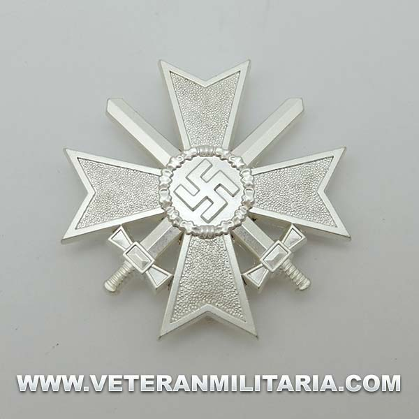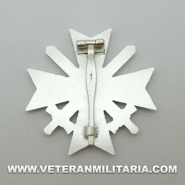 Reproducción de la Cruz al Mérito de Guerra de 1ª clase con espadas, fabricada en aleación de color plateado con marcajes del fabricante.