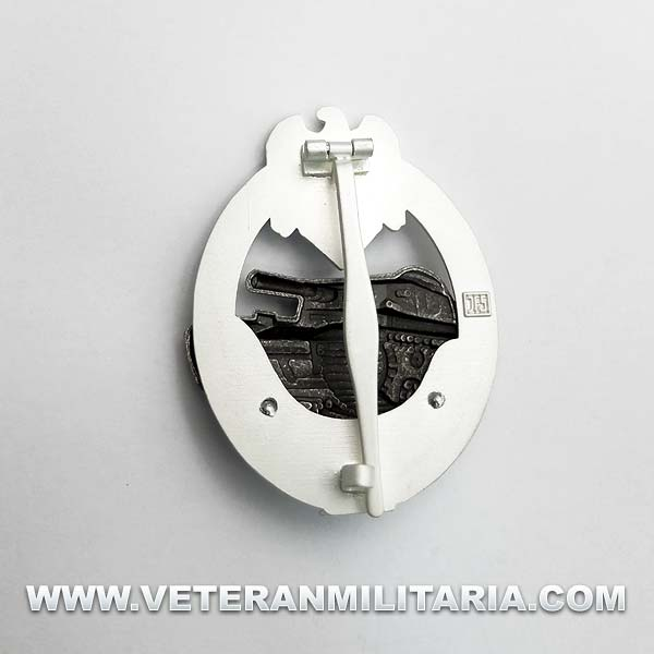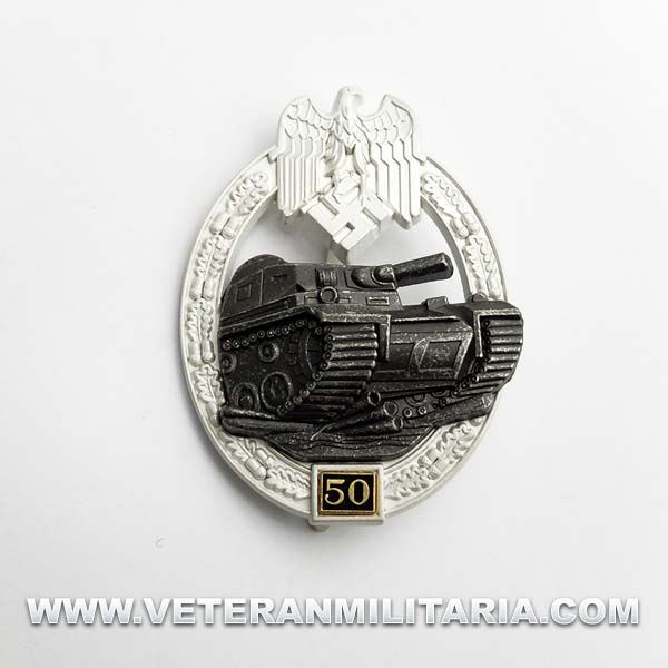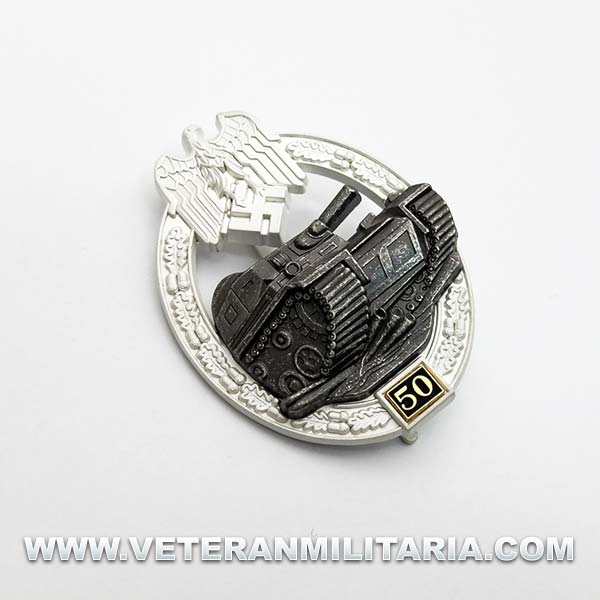 Reproducción Distintivo de Lucha con Carros de Combate 50 combates (Panzerkampfabzeichen). Fabricada en aleación de metal de color plata, con marcajes del fabricante.