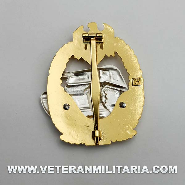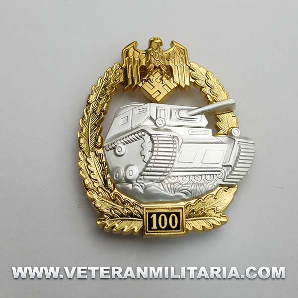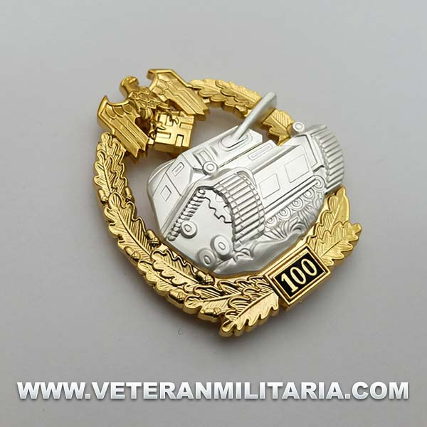 Reproducción Distintivo de Lucha con Carros de Combate 100 combates (Panzerkampfabzeichen). Fabricada en aleación de metal la corona de color dorado y el centro de color plata, con marcajes del fabricante.
