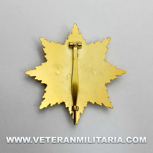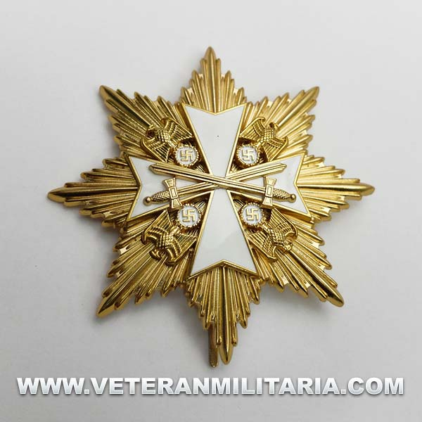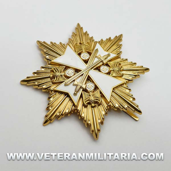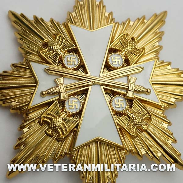 Reproducción de la Gran Cruz Dorada de la Orden del Águila-Militar. Fabricado en metal, se compone de una gran estrella dorada de ocho puntas, en el centro la cruz de malta esmaltada de blanco y perfilados de oro, en el centro de la cruz dos espadas doradas, entre los brazos águila alemana en dorado. En reverso pasador de sujeción.