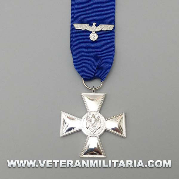 Reproducción de la Cruz 2ª clase por 18 años de servicio en la Wehrmacht, fabricada en metal en color plata con cinta de color azul oscuro.
