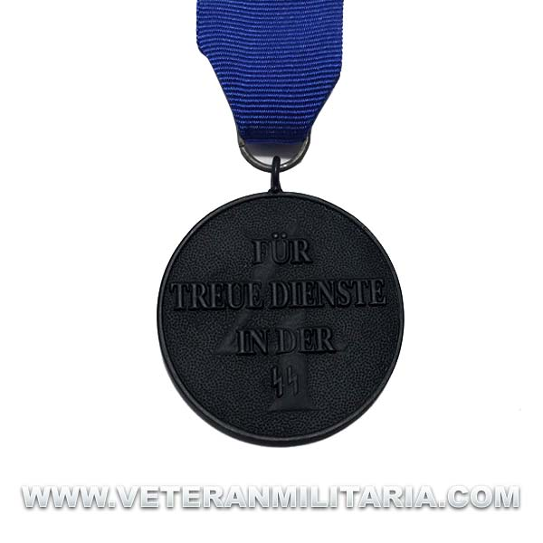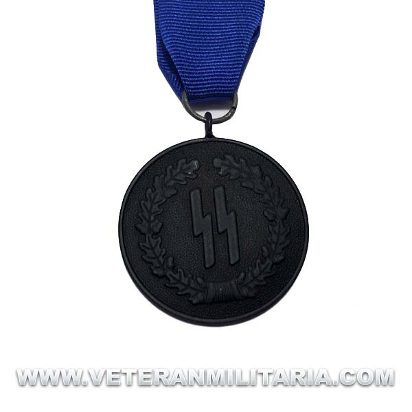 Reproducción de la medalla por 4 años de servicio en las Waffen-SS, fabricada en metal de color negro con cinta de color azul oscuro.