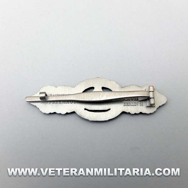 Reproducción de la insignia de combate de submarinos, fabricada en metal de color plata, en reverso cierre de aguja y marcajes del fabricante.