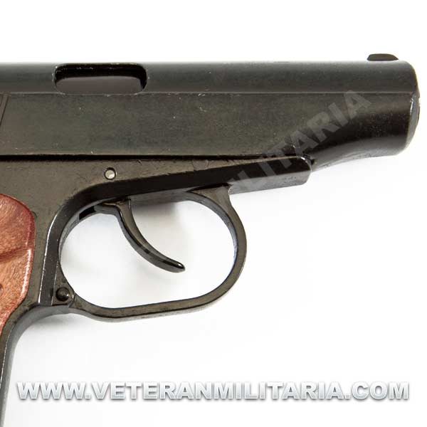 Reproducción de pistola Makarov PM, fabricada en metal y cachas de plástico, con mecanismo simulador de carga y disparo, cargador extraíble.