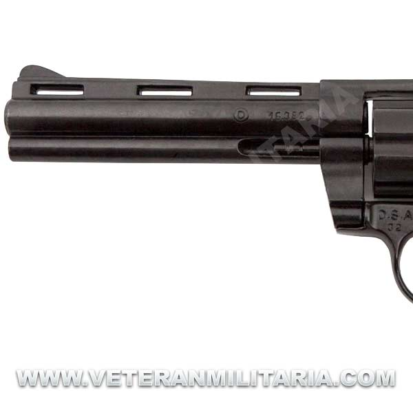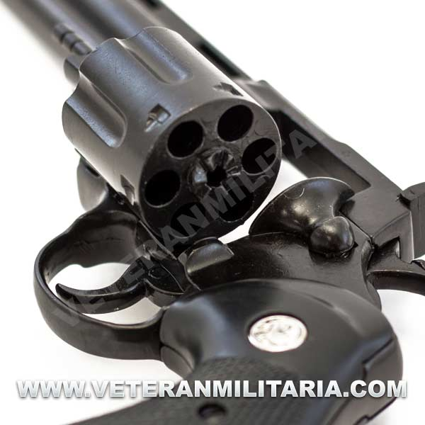 Reproducción de revólver, fabricado en metal y cachas de plástico, con mecanismo simulador de carga y disparo y tambor giratorio.
