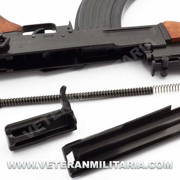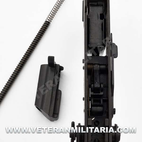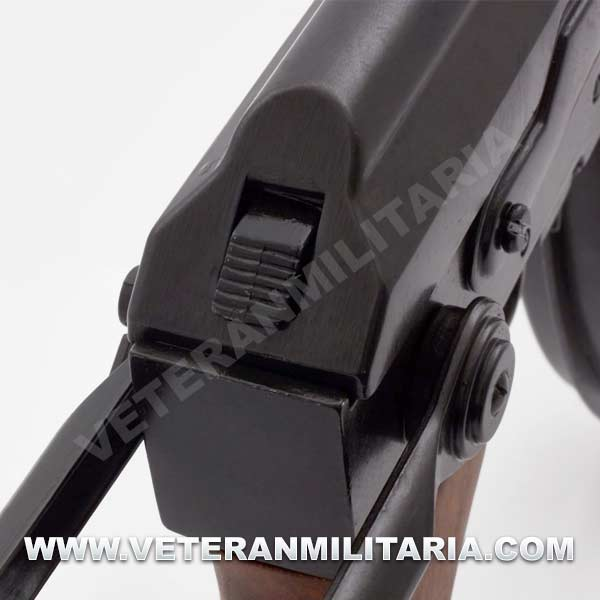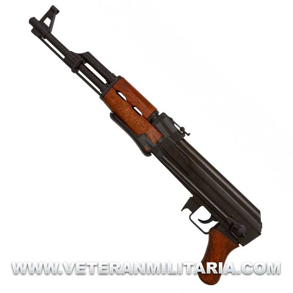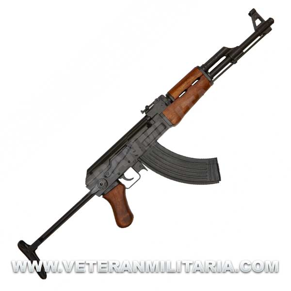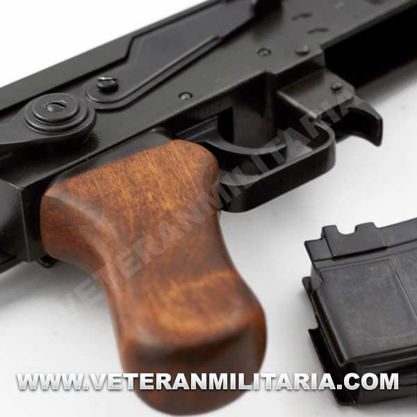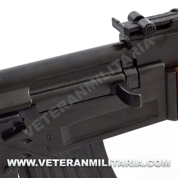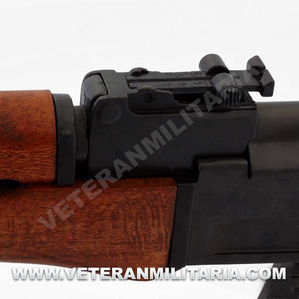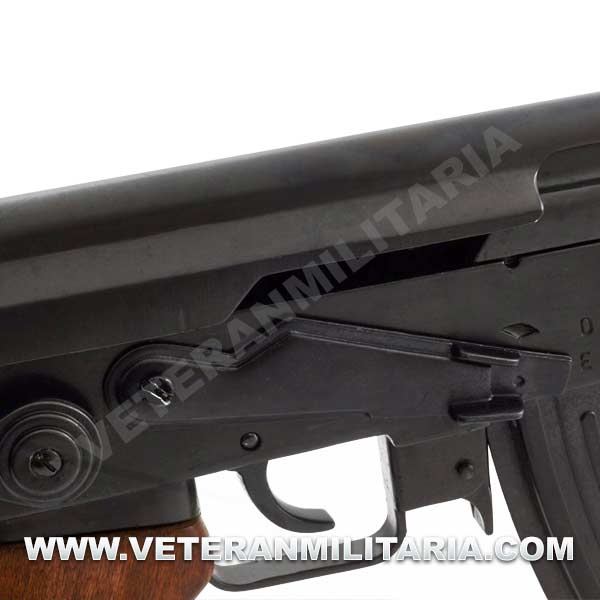 Reproducción de fusil, fabricado en metal y madera, con mecanismo simulador de carga y disparo, piezas desmontables y cargador extraíble.