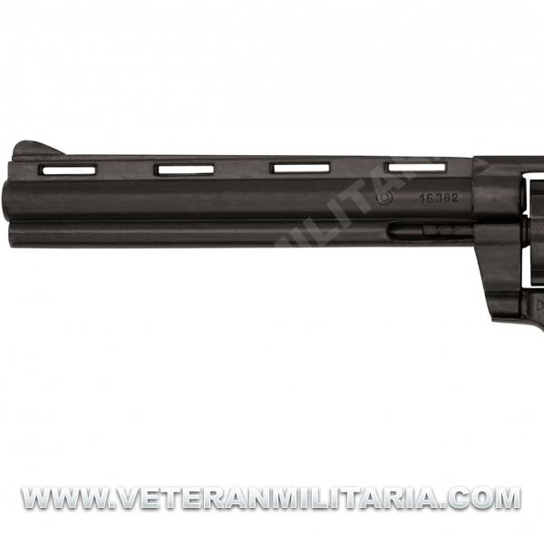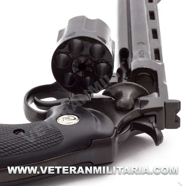 Reproducción de revólver, fabricado en metal y cachas de plástico, con mecanismo simulador de carga y disparo y tambor giratorio.