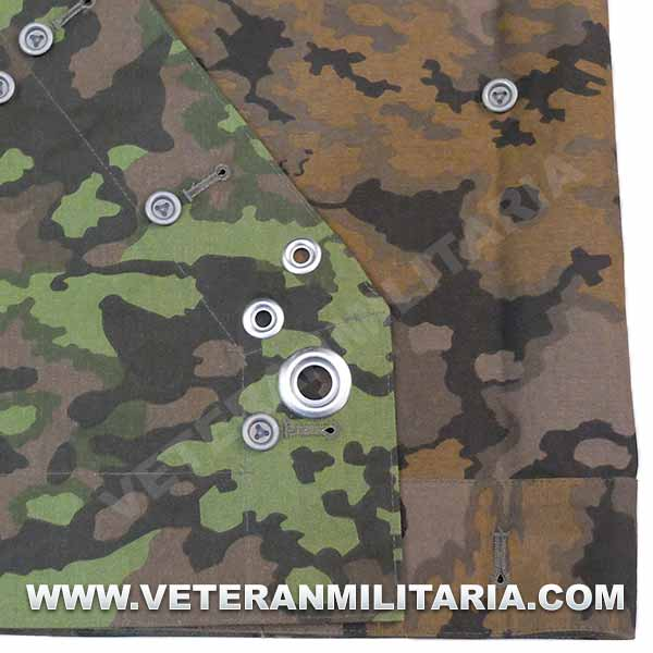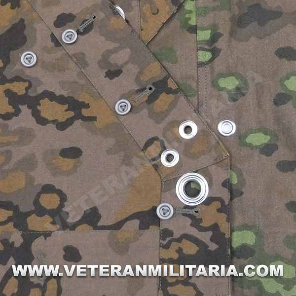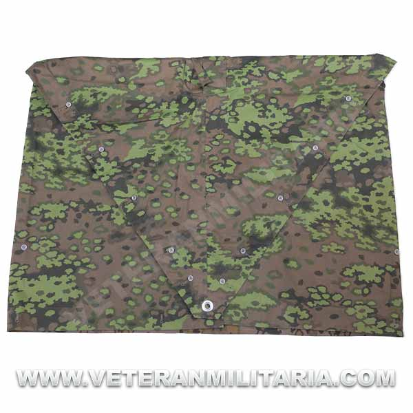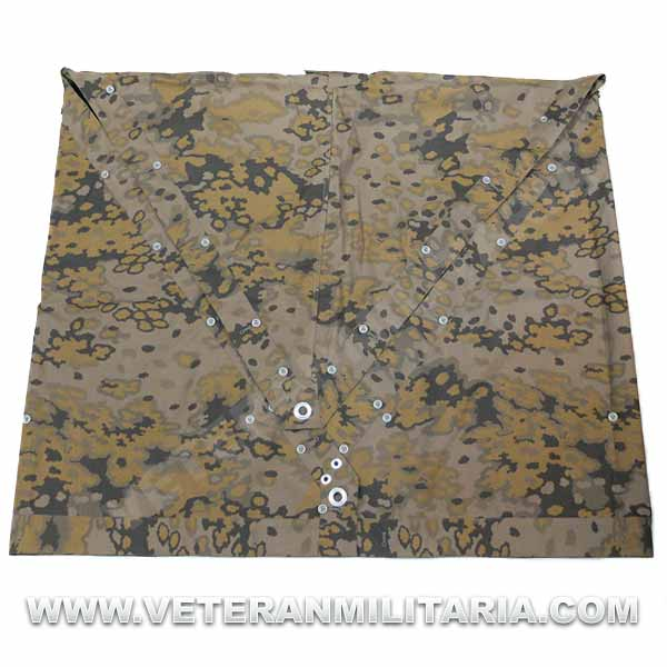Reproducción de zeltbahn Oak B para las unidades waffen ss. Fabricado en loneta de algodón, repelente al agua, camuflaje Oak B, botones y aros metálicos, forma triangular. Uniendo 4 triángulos, puede montar una tienda de campaña.