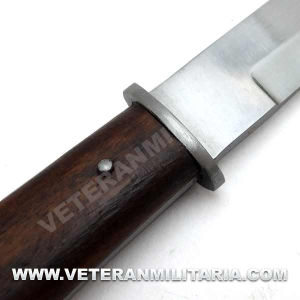 Reproducción de cuchillo de trinchera alemán (Grabendolch), fabricado en acero con cachas de madera, funda con pinza para sujeción. Hoja no afilada