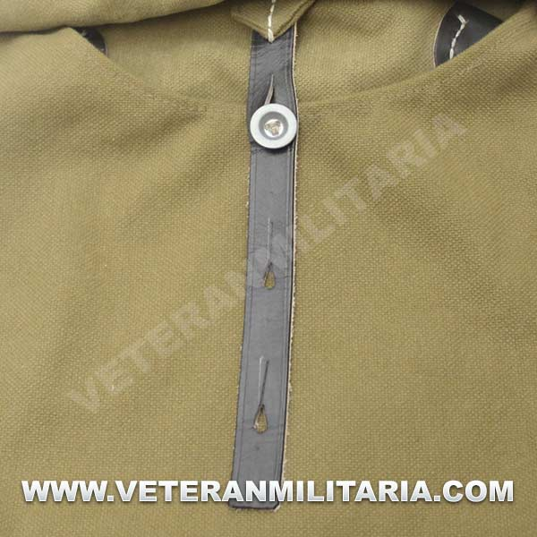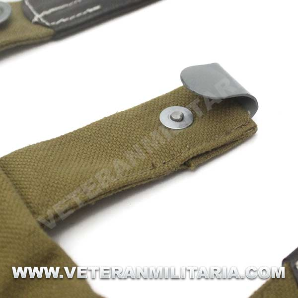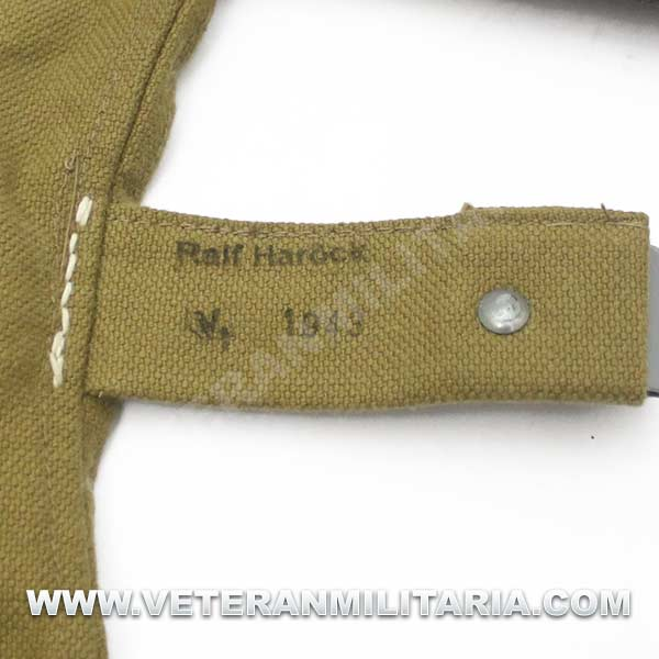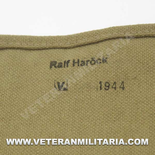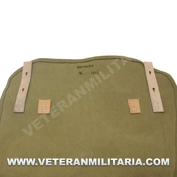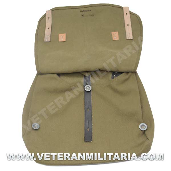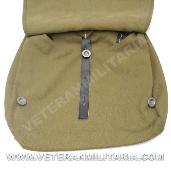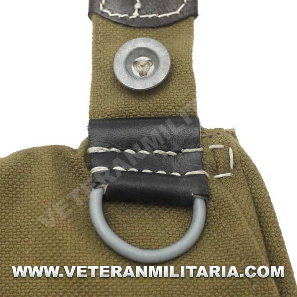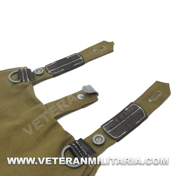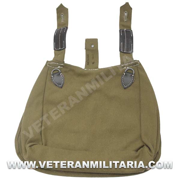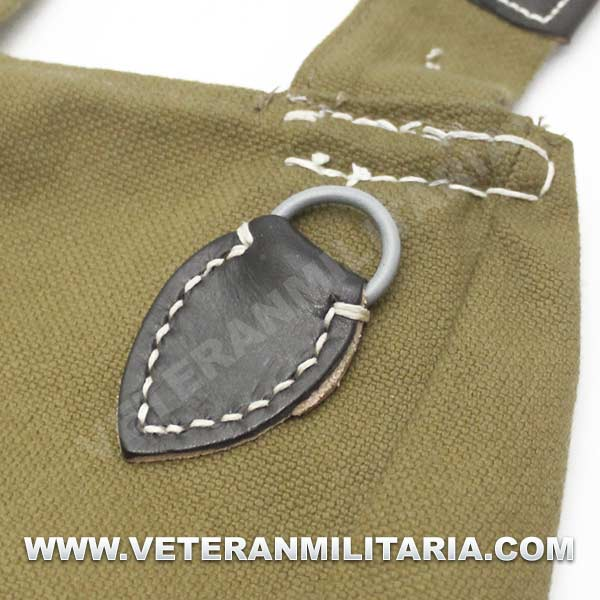 Perfecta reproducción de la panera alemana M31, fabricada en lona de algodón, cosidos con hilos de algodón, refuerzos de curo, anillas en forma de D, trabillas de cuero, La solapa se cierra con dos correas de cuero con dos ojales, marcajes de fabricante.