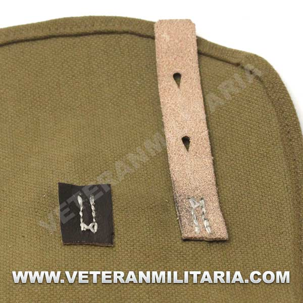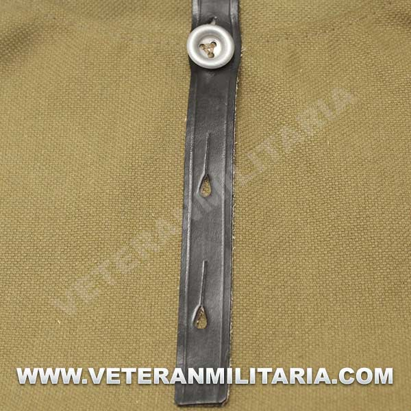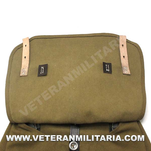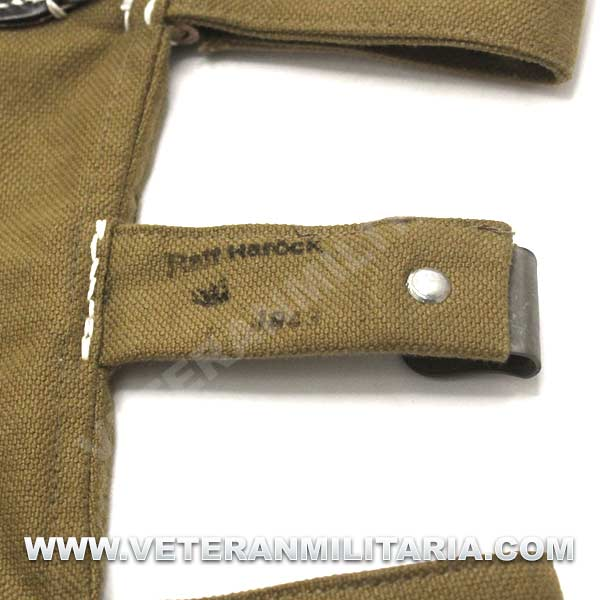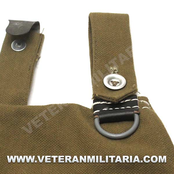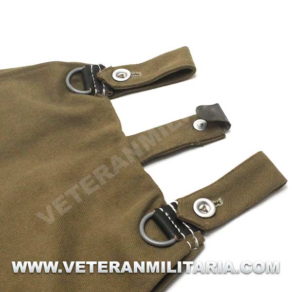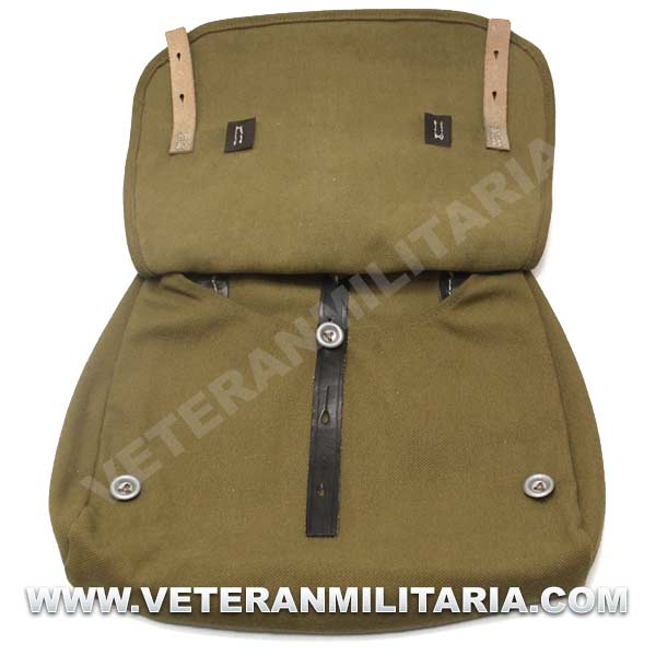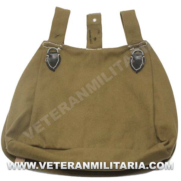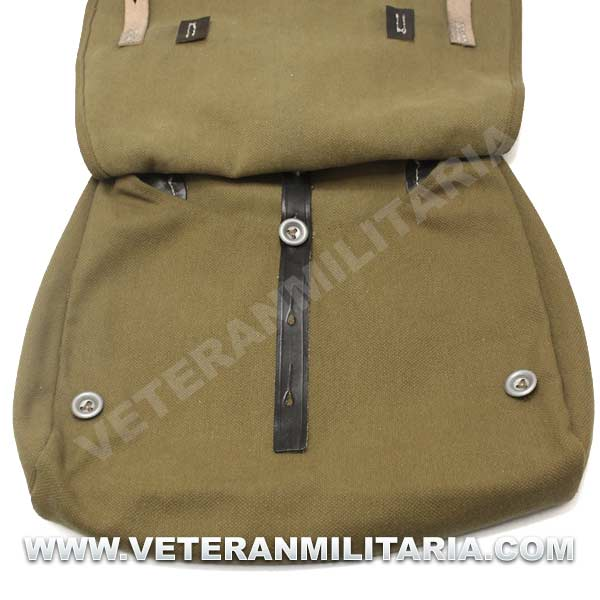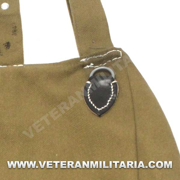 Perfecta reproducción de la panera alemana M31, fabricada en lona de algodón, cosidos con hilos de algodón, anillas en forma de D, trabillas de cuero, La solapa se cierra con dos correas de cuero con dos ojales, marcajes de fabricante.