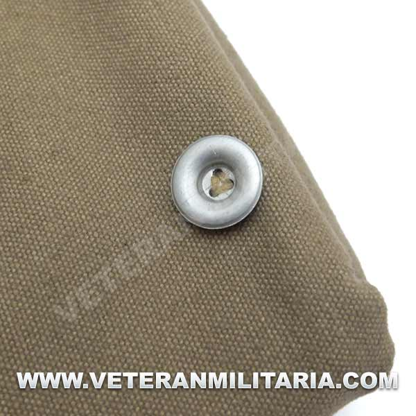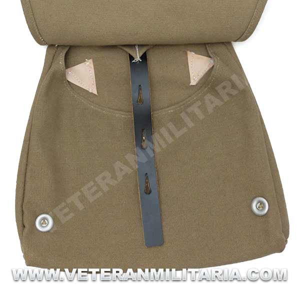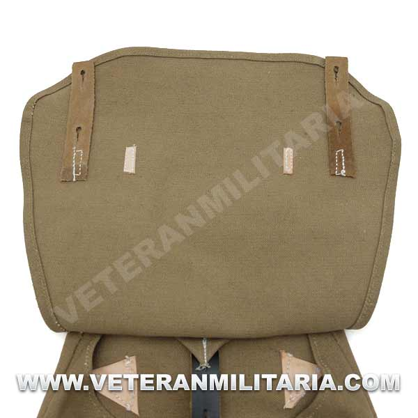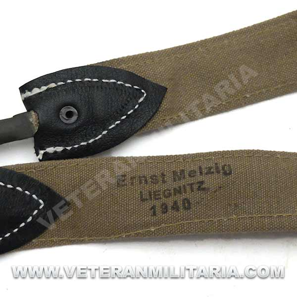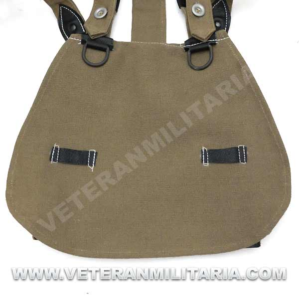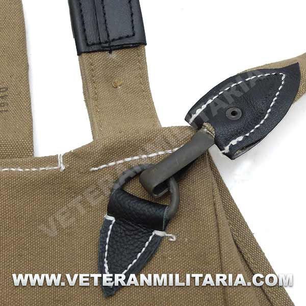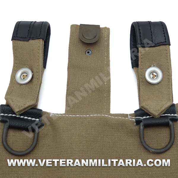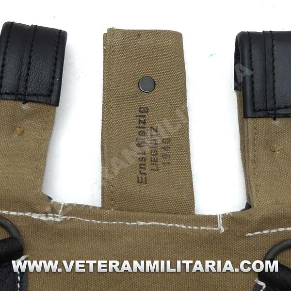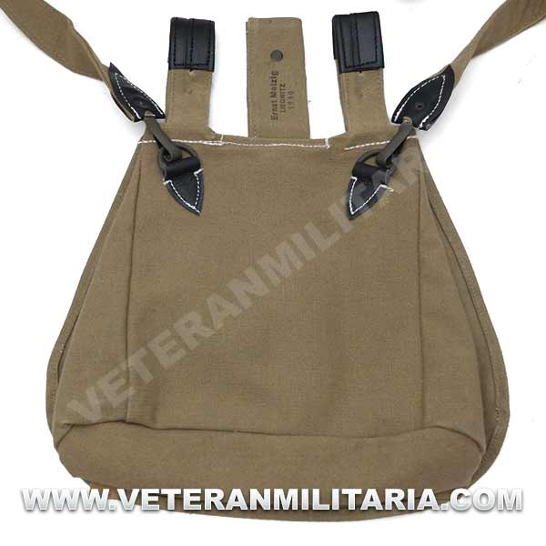 Panera alemana con correas para Wehrmacht y Waffen SS, fabricada en loneta color marrón/oliva. Marcajes del fabricante en su reverso.
