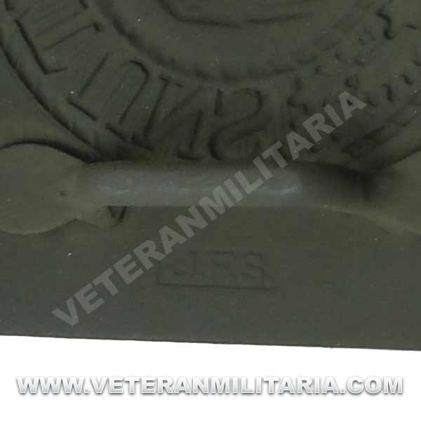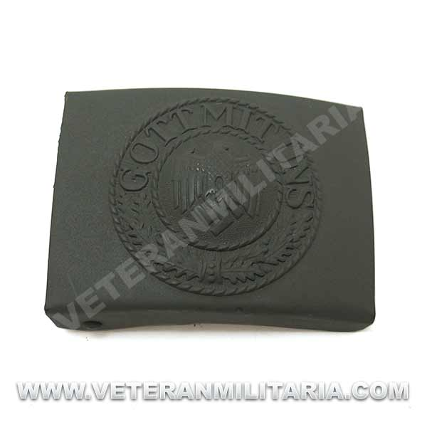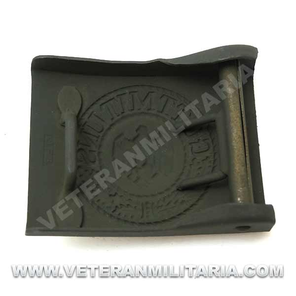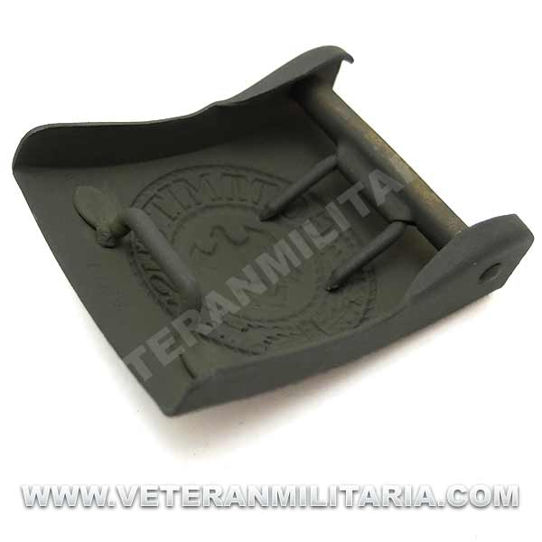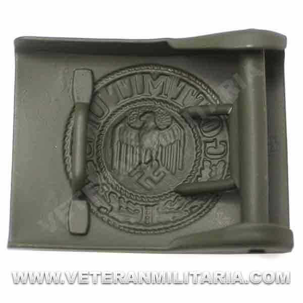 Reproducción de la hebilla de la Wehrmacht, fabricada en acero, lisa de color feldgrau, con la marca del fabricante en su reverso J.F.S