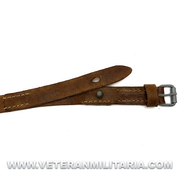 Reproducción de correa auxiliar con doble sujeción para manta o marmita, fabricada en piel natural, cosida con hilo sin teñir, de color marrón.