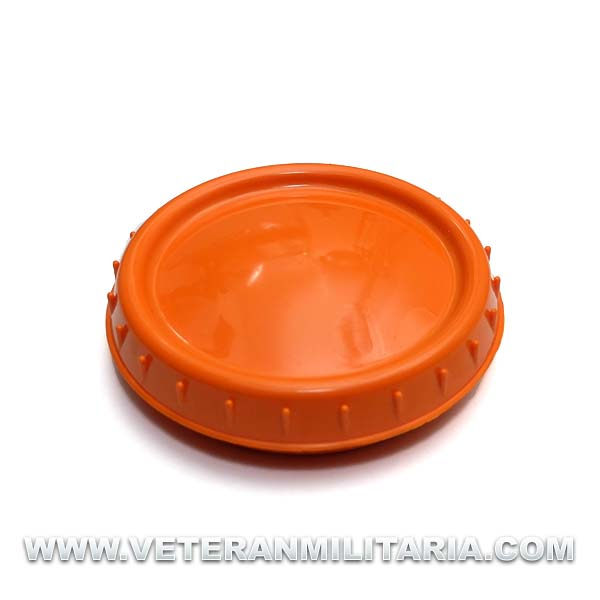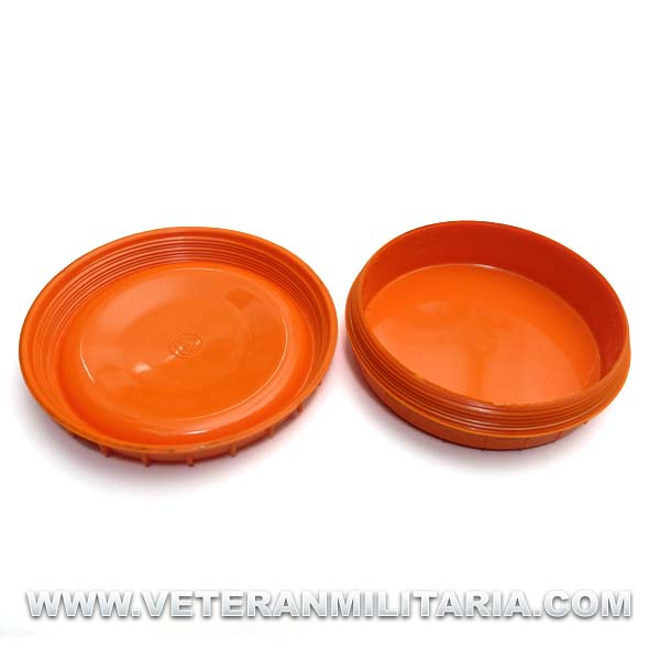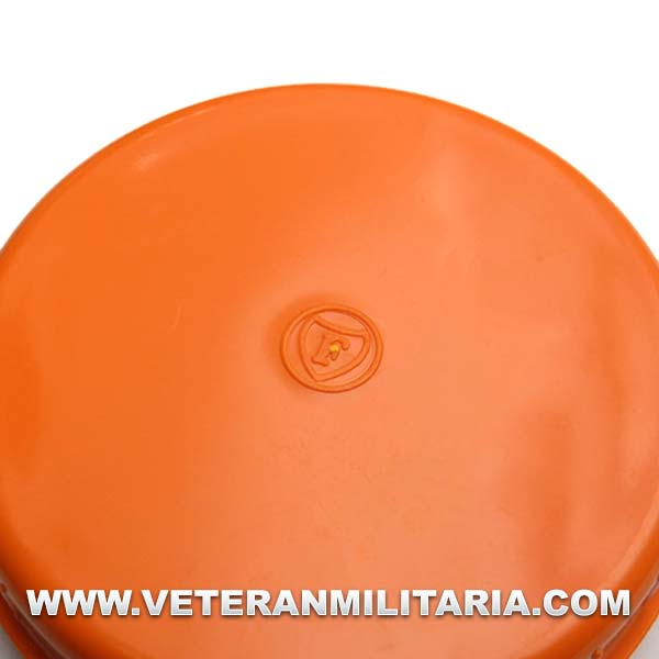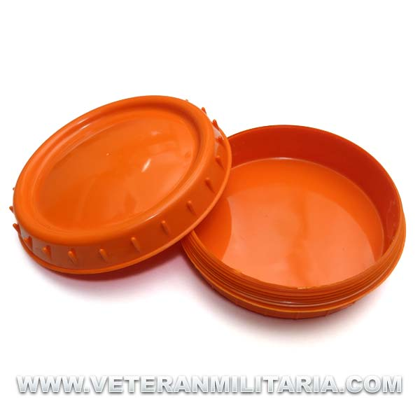 Reproducción de mantequera alemana, fabricada en plástico de color naranja.