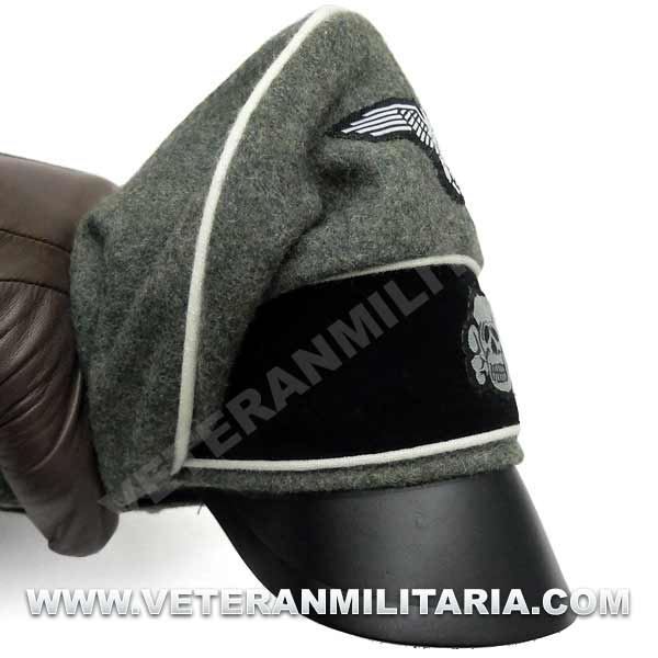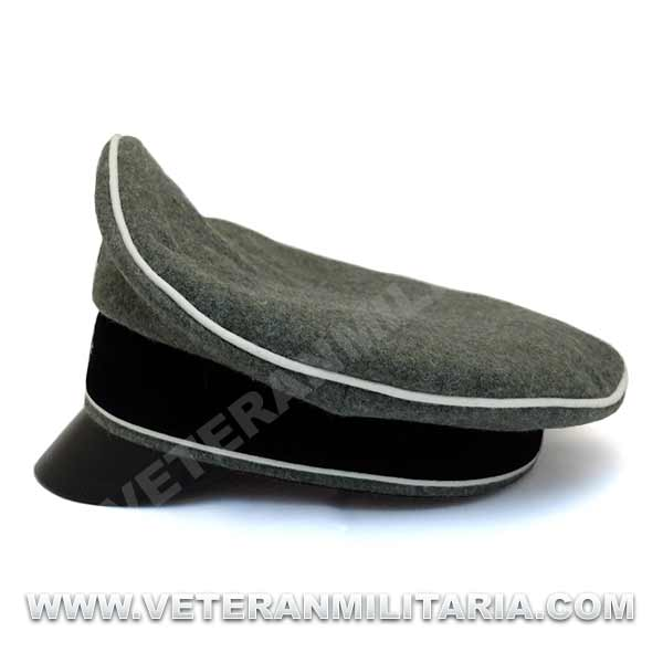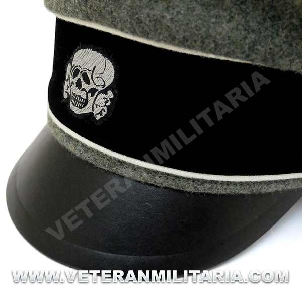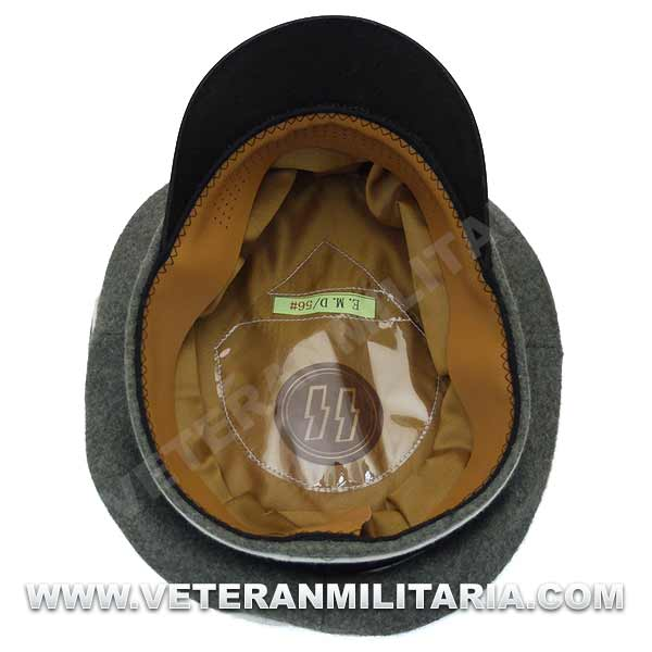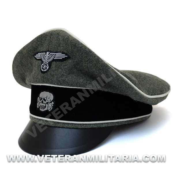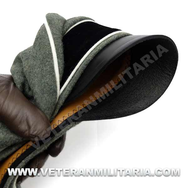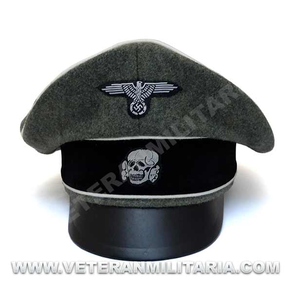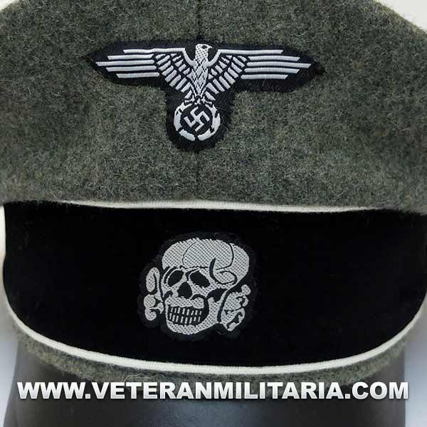 Reproducción de la gorra de plata modelo 1934 para oficiales de la Waffen SS (Alter Art), fabricada en lana de color feldgrau, visera de cuero, insignias bordadas en vevo, banda de color negro, forro mezcla tela de seda y algodón.