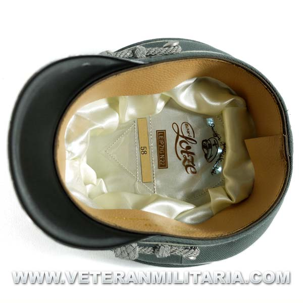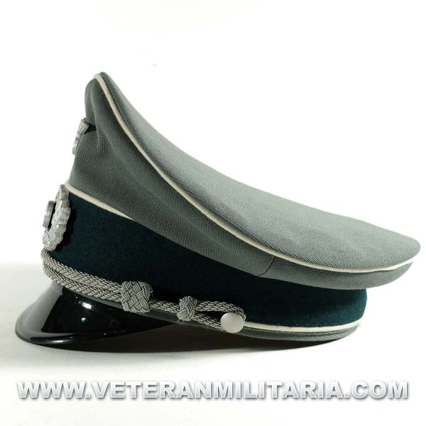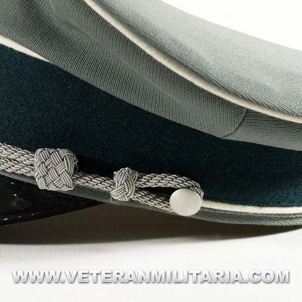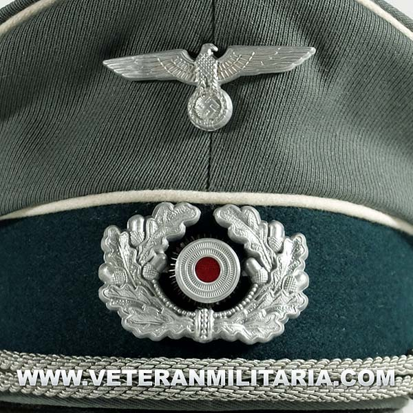 Gorra de plato para oficiales de la Wehrmacht, fabricada en tela de gabardina color feldgrau, banda de terciopelo color verde oscuro, ribete de lana de color blanco, forro de satén, insignias águila y la cucarda.
