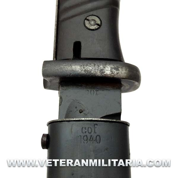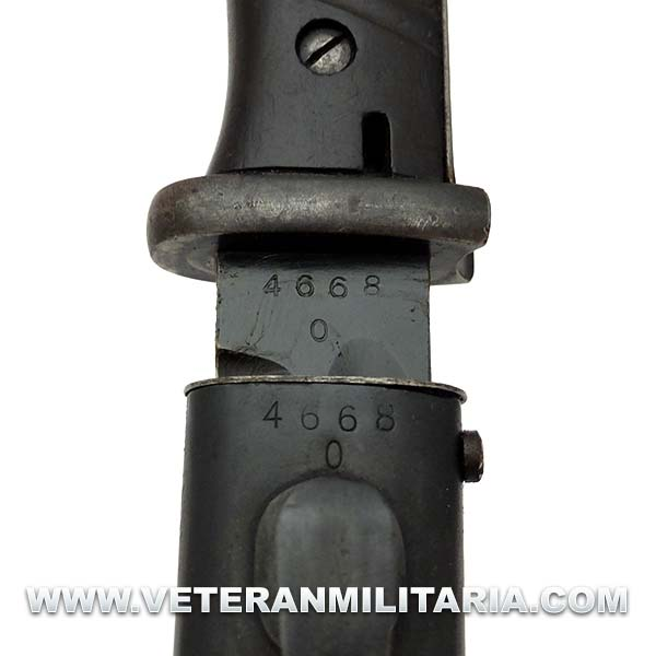 Bayoneta para K98 con la misma numeración en la hoja y la vaina 4668 y el fabricante cof 1940, cachas de baquelita, la hoja en perfectas condiciones, WAFFENAMT en la empuñadura y la vaina. Tahalí de cuero de color marrón, remaches y costura en perfectas condiciones, marcajes de fabricante L.B.A. (S) Fl.H.Kdtr (Fl.H.Kdtr. Fliegerhorst-Kommandantur)