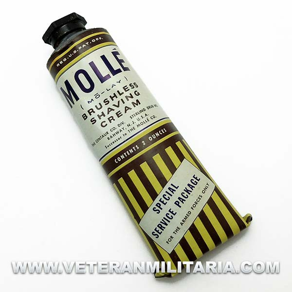 Crema de afeitar Molle original, tubo de crema con caja de cartón. Estas cajas de Molle Shaving Cream fueron empaquetadas y marcadas específicamente para las Fuerzas Armadas.
