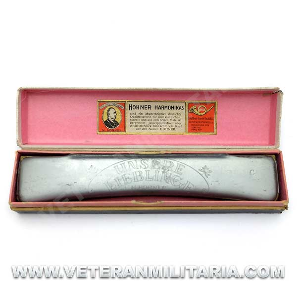 Harmónica alemana de la marca Hohner, la harmónica en muy buenas condiciones tiene grabados en los dos lados en uno Unsere Lieblinge (nuestras queridas), la caja presenta pequeña rotura en una de las esquinas.