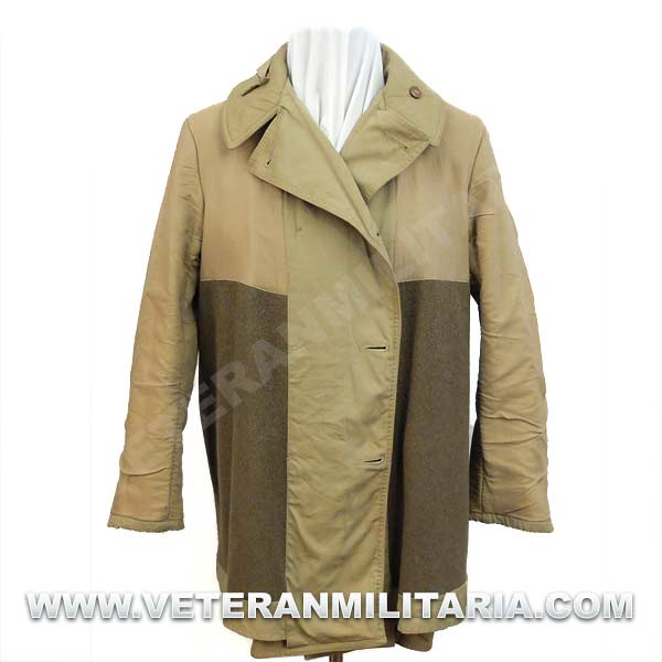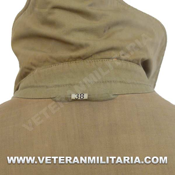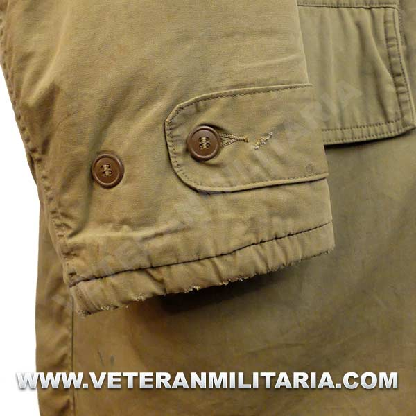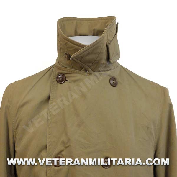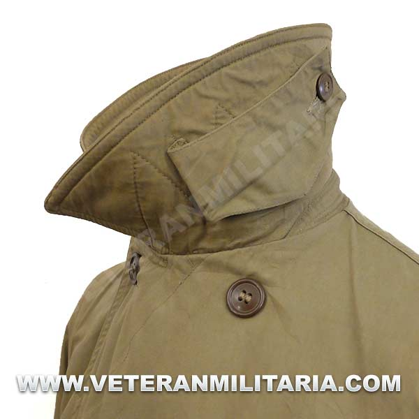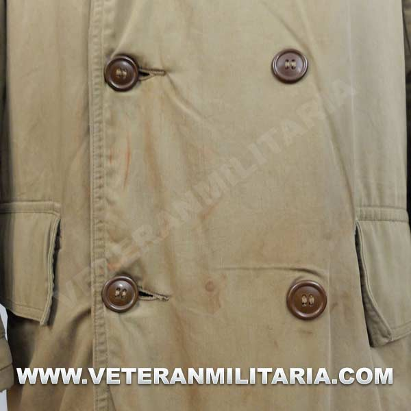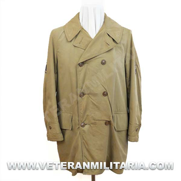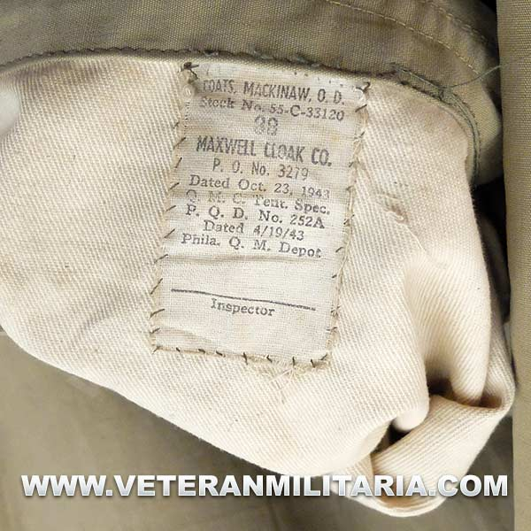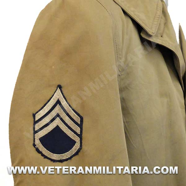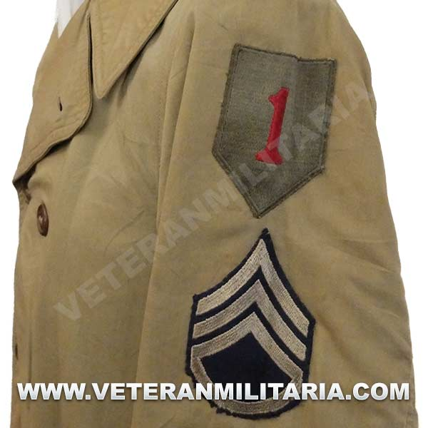 Abrigo Mackinaw modelo a partir de 1943 sin cinturón, abrigo en muy buenas condiciones talla 38R, en el bolsillo derecho etiqueta de fabricante. Las insignias son de sargento y el parche de la 1ª División de Infantería (uno rojo)