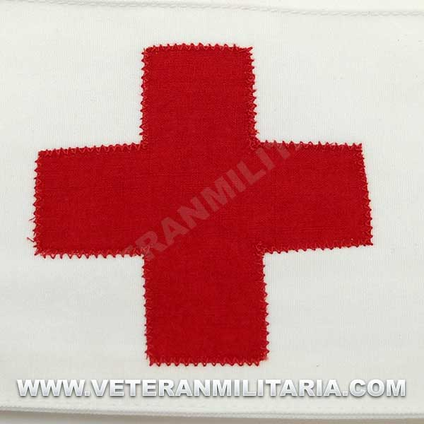 Brazalete de sanitario de la cruz roja, fabricado en tela de algodón blanca en el centro cruz roja cosida con hilo rojo, en reverso sello con números M 770221