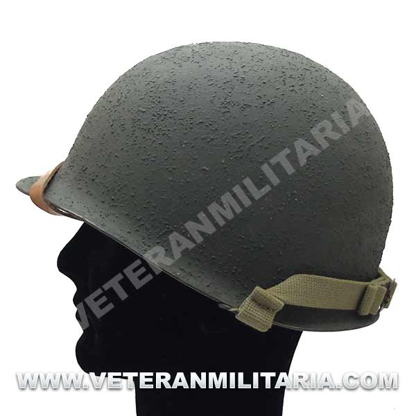 Casco M1, la olla del casco es original corte delantero, números no visibles, pintura restaurada, barboquejo es de reproducción, sotocasco de fibra de posguerra.