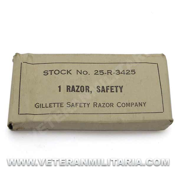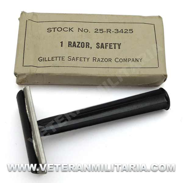 Maquinilla de afeitar original, maquinilla de dos piezas metálicas y mango de baquelita. Fabricada por Gillette Division 25-R-3425, caja presenta pequeñas arugas.