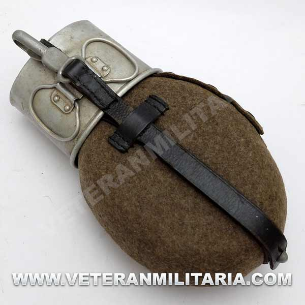 Cantimplora alemana modelo 31 de principio de guerra, cantimplora fabricada en aluminio como el vaso, marcajes de fabricante en el cuello de la cantimplora como en el tapón S.K.N 39, la funda con los mismos marcajes, el vaso sin pintura original, marcado ESB 36, gancho con marcajes GAM 39, correas de cuero en muy buenas condiciones.