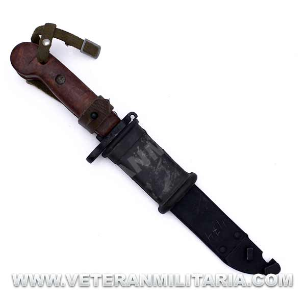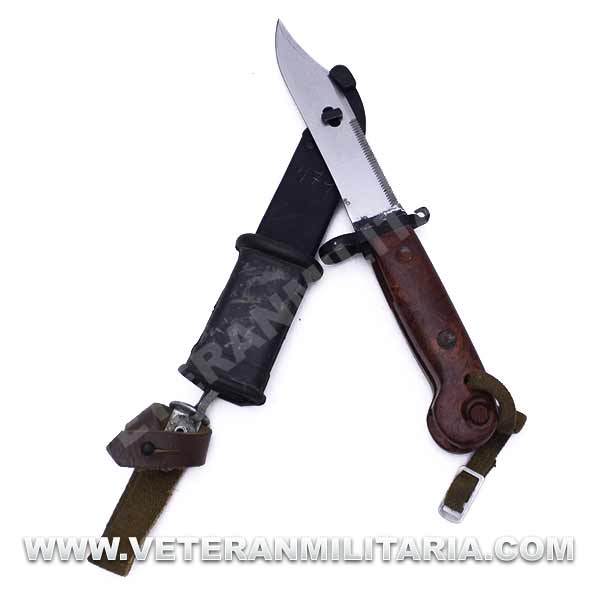 Bayoneta AK47/AKM, cachas de baquelita marrón, la hoja parcialmente dentada, vaina de color negro con goma negra, correa de mano de loneta, la bayoneta puede transformarse rápidamente en un alicate - cortador de alambre