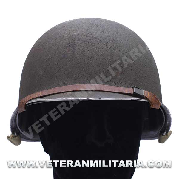 Casco M1, corte delantero, numero de serie 126B (1941), trabillas de barboquejo fijas, conserva mucha pintura original, sotocasco (liner) marcado Westinghouse.
