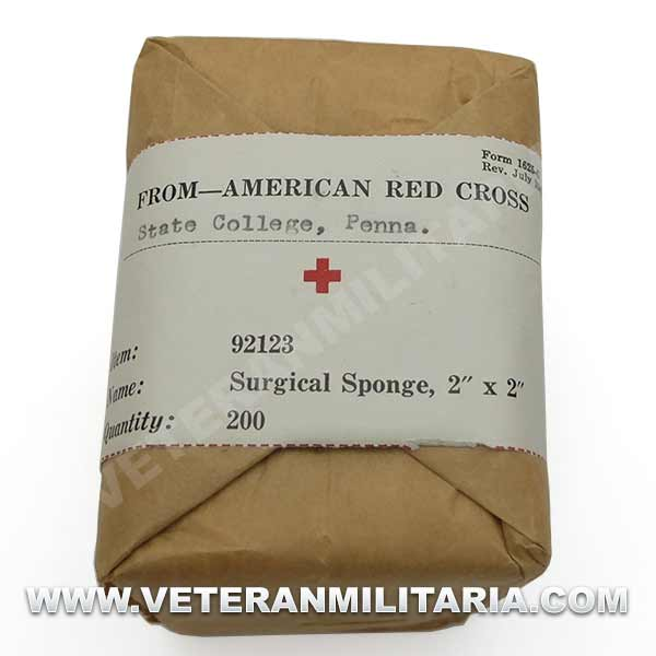 Esponja quirúrgica de la Cruz Roja Americana, envasada en papel kraft, en la parte delantera etiqueta FROM – AMERICAN RED CROS, fecha de fabricación 1942, numero del lote.