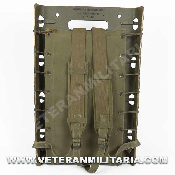 Porta mochila Packboard US completo, fabricado en madera contrachapada, la madera en forma de U de color OD con marcajes US y en reverso el fabricante como el año 1944. El estante de carga con marcajes de fabricante y año 1944, las correas con marcases, cuerda.