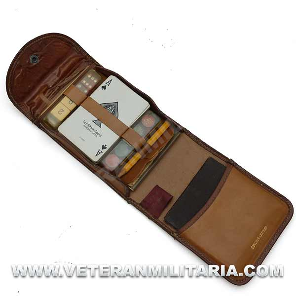 Set de juegos de mesa, ajedrez, baraja de cartas, dados, el set esta en un estuche de cuero, contiene instrucciones para jugar a ajedrez, bloc de notas y lápiz.