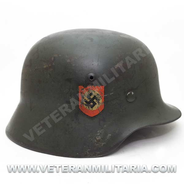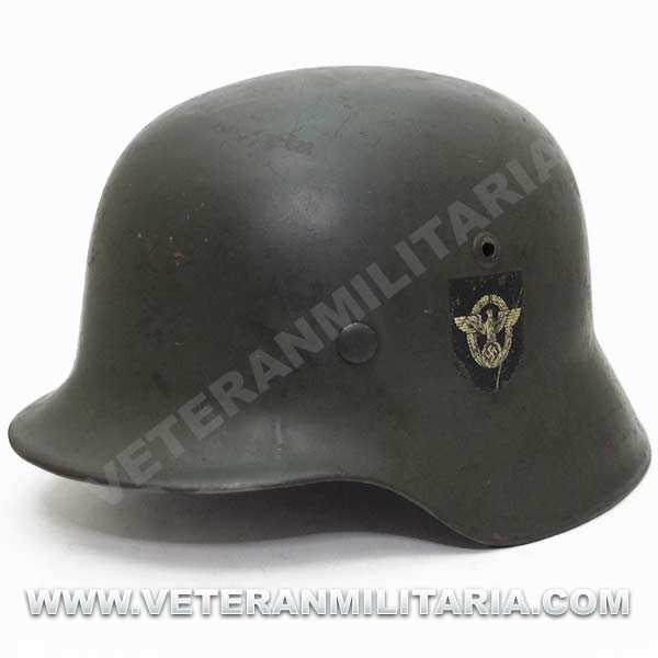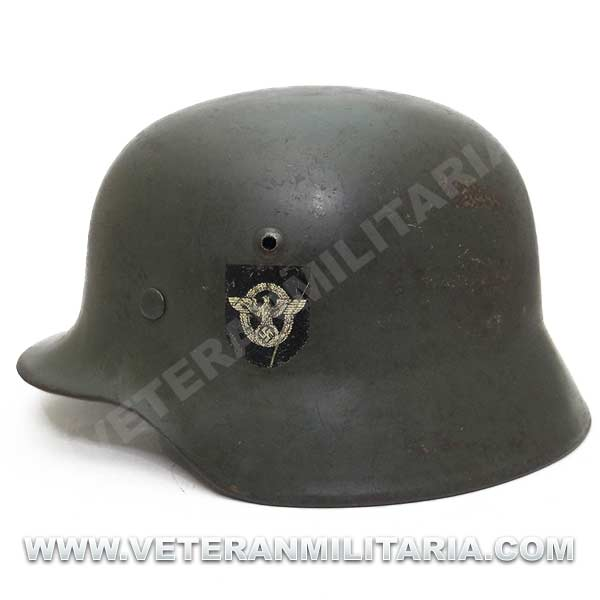 Casco de combate alemán M1935 con doble calca de policia, el casco es un NS64 (NS poco legible) con el número de lote D170. El exterior del casco presenta un acabado de pintura verde manzana de época, la pintura tiene algunos rayones de la época debido al uso, las calcomanías presentan algunos rasguños, el interior está completo, sello de aceptación 1938, falta el barboquejo.