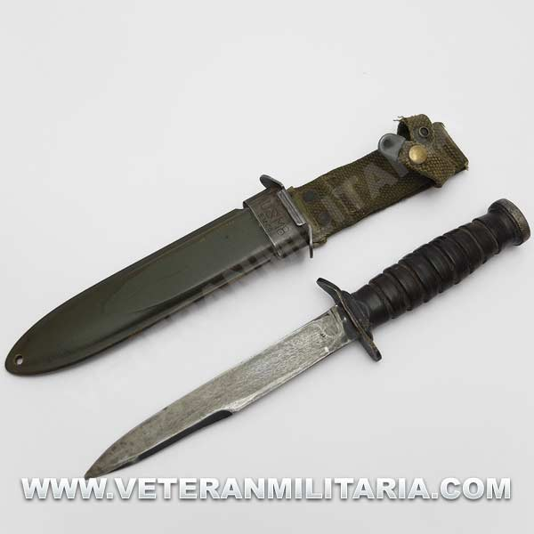 Cuchillo de combate US M3 con vaina US M8 B.M.CO, fabricado por Camillus Cutlery Co. Es el 3 modelo, la hoja fue afilada por esto perdió la forma original, en el guarda marcajes US M3 Camillus, la curiosidad que el guarda esta invertido, mango en muy buenas condiciones, vaina en buenas condiciones con marcajes US M8 B.M.CO.