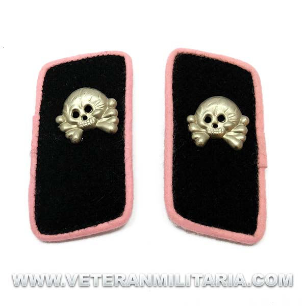 Reproducción de parchas de cuello de tropas panzer de Wehrmacht, ribete de color rosa, fondo de lana negra y las calaveras de metal.