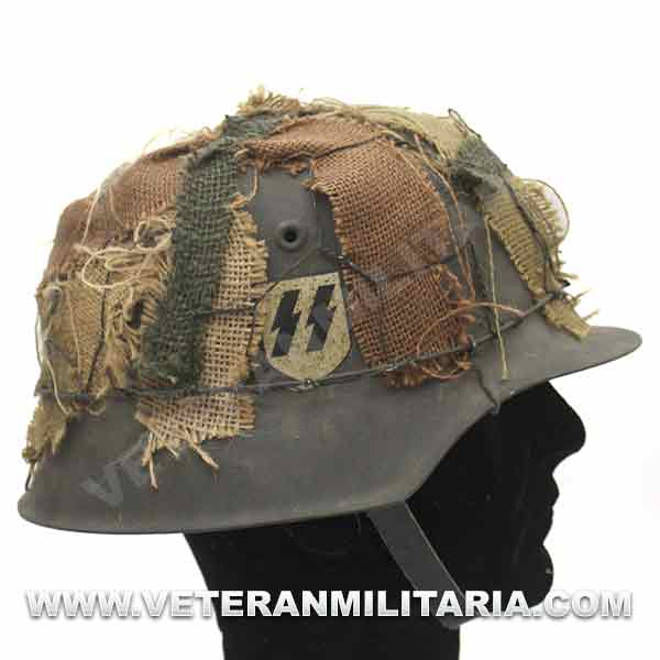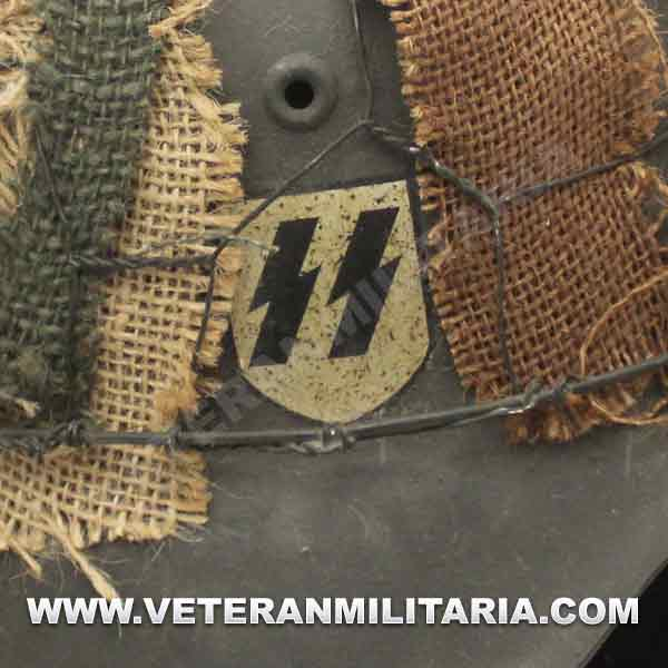 Reproducción de casco M42 con red de gallinero y tela arpillera entretejida en la red de gallinero en varios colores le da un aspecto único, una calca SS, fabricado en acero, completo con interior y barboquejo, Marcajes de fabricante.