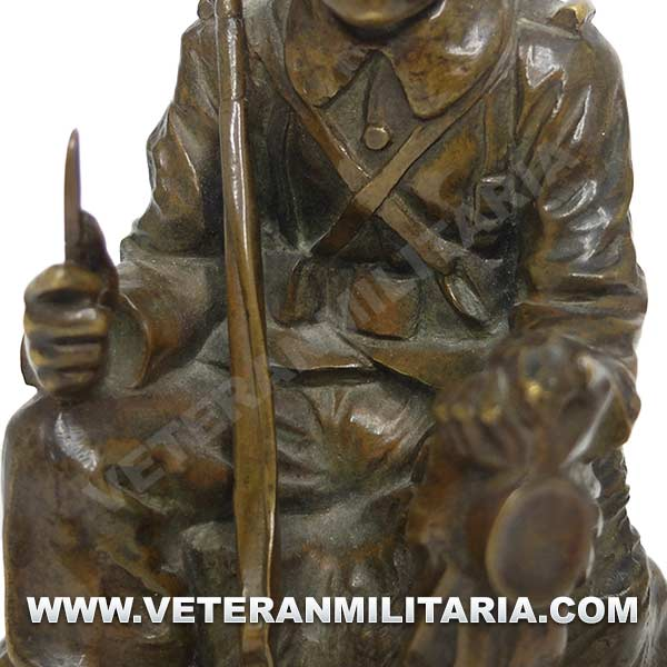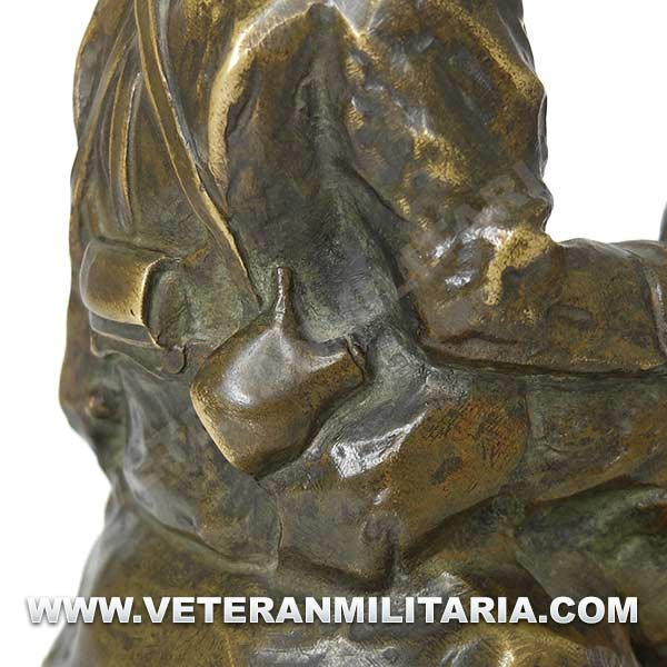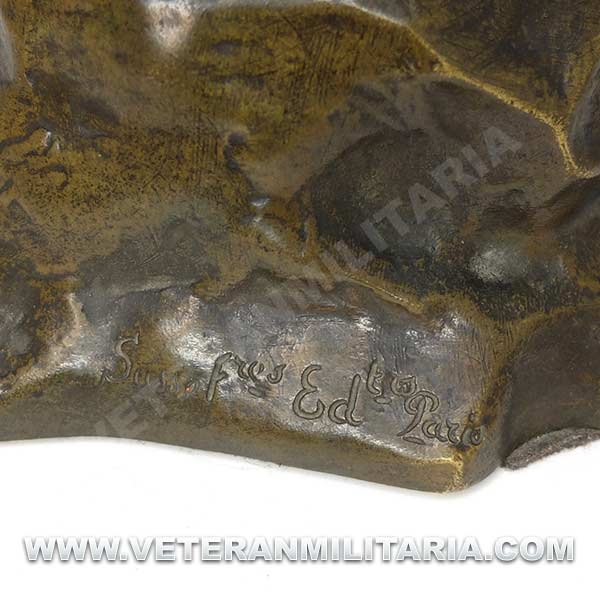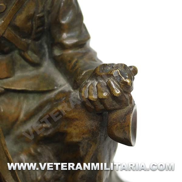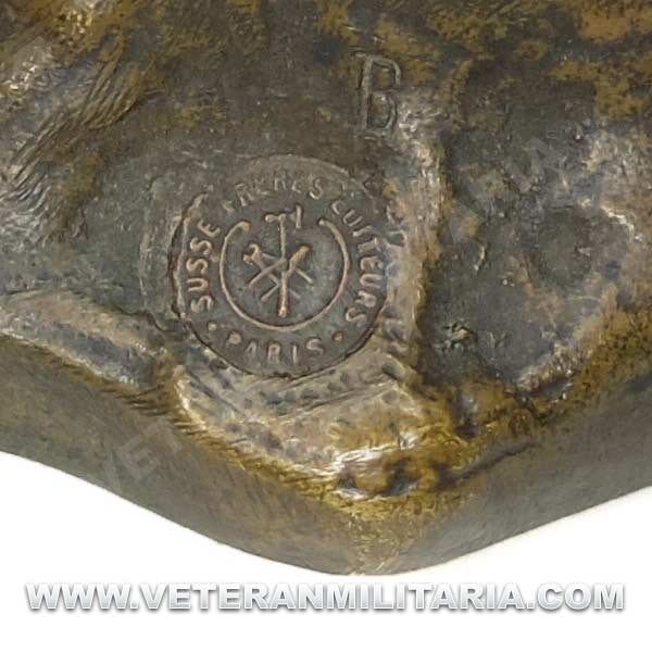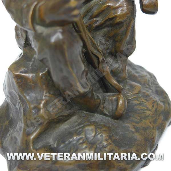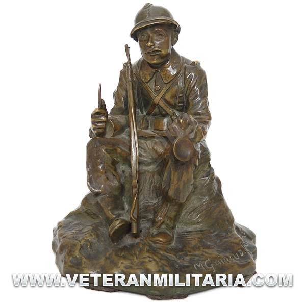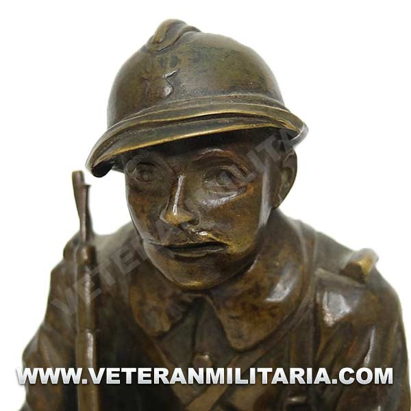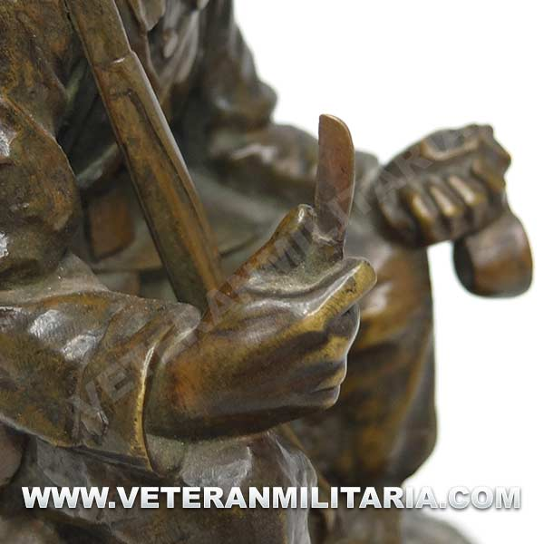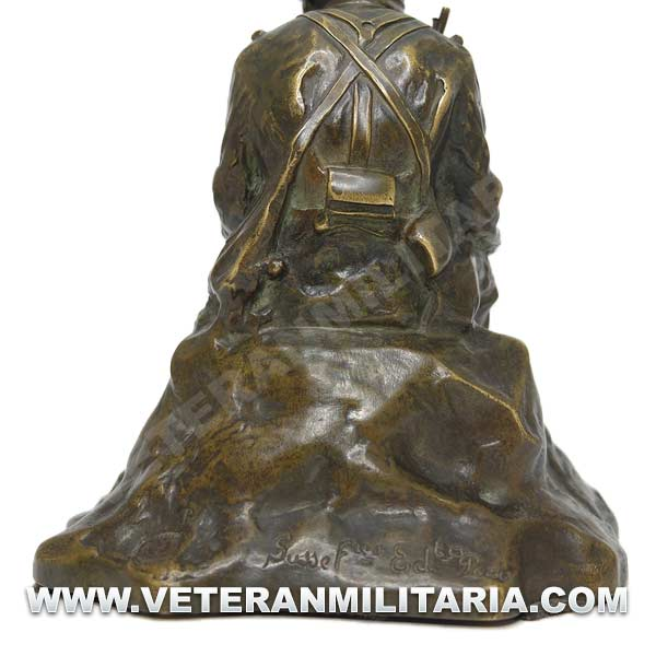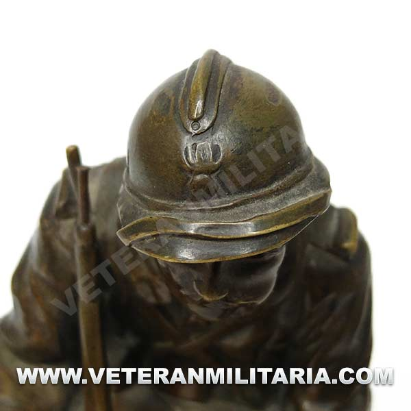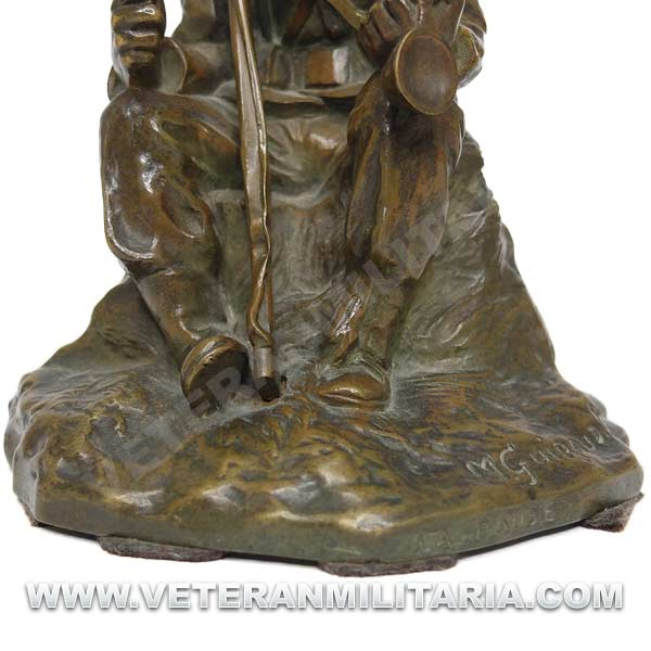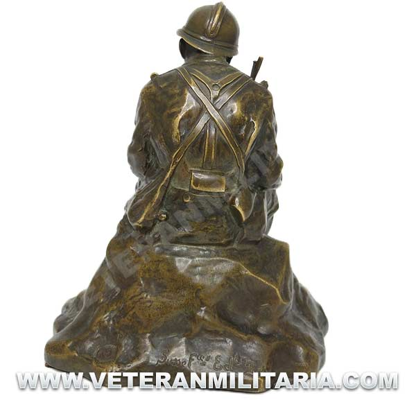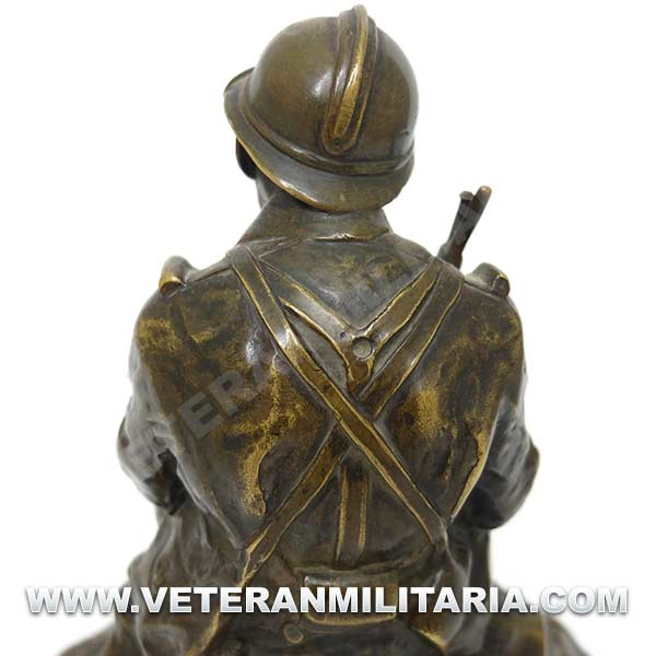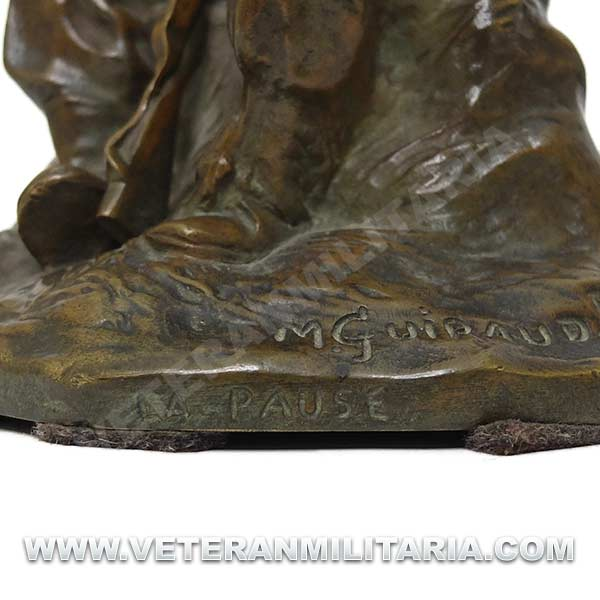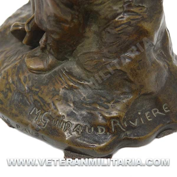 Escultura de soldado Frances en bronce de la primera guerra mundial, representa a un soldado sentado comiendo, con un cuchillo en una mano y una taza en la otra. La es titulada “LA PAUSE” firmada por Maurice Guiraud Rivière y sello de fundición de Susse Freres editeurs en sus dos versiones cachet circular y nombre abreviado.
