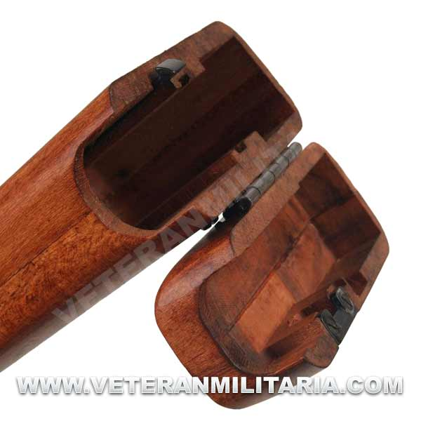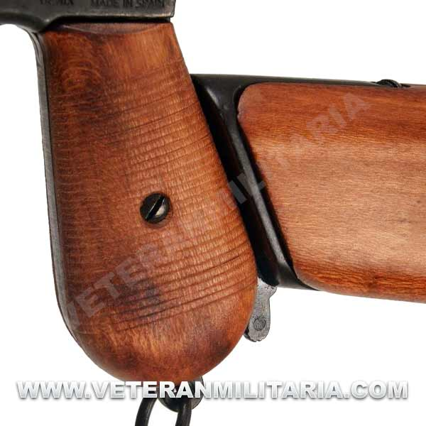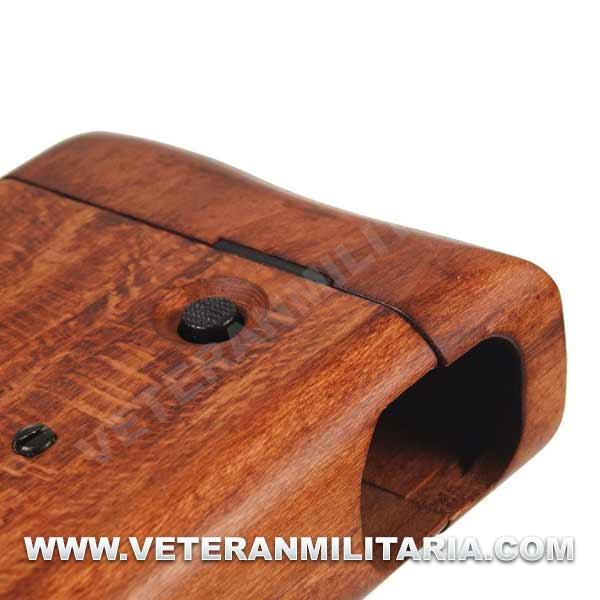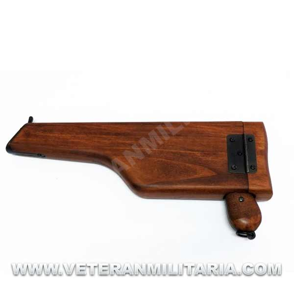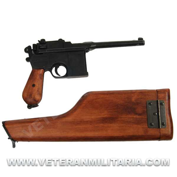 Reproducción de pistola Mauser C96, fabricada en metal, con cachas y funda-culata de madera, con mecanismo simulador de carga y disparo.