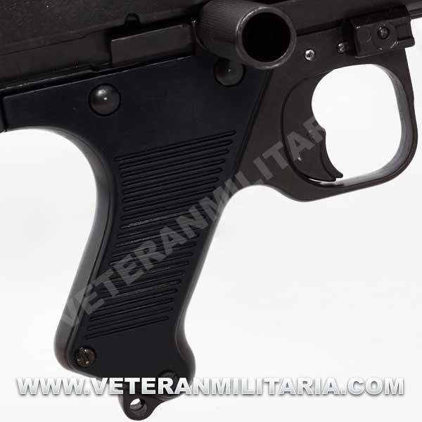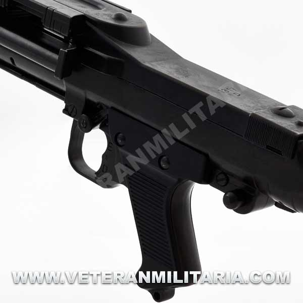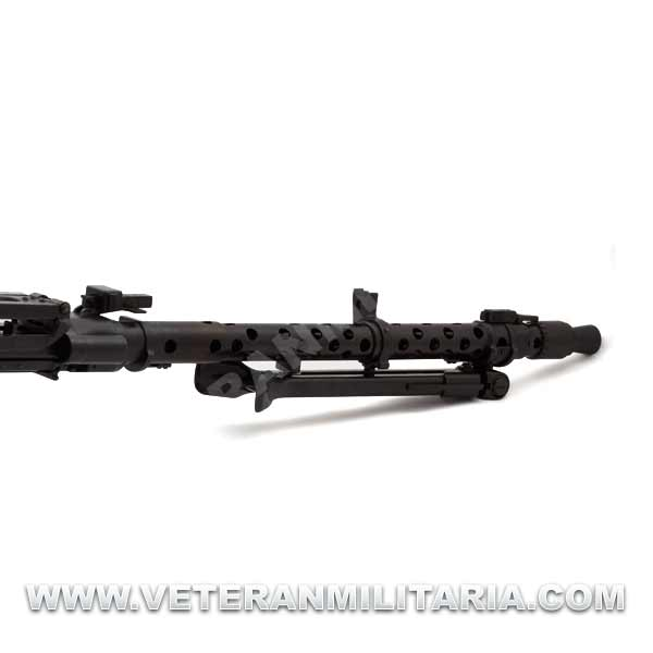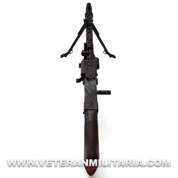 Reproducción de la ametralladora alemana MG34, fabricada en metal, culata de madera y cachas de plástico, con mecanismo simulador de carga y disparo, y bípode móvil.