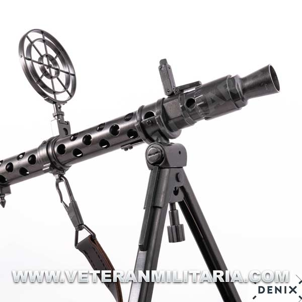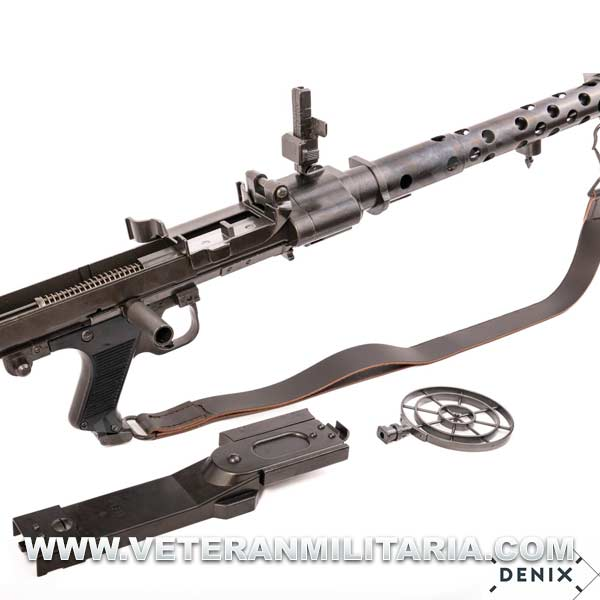 Reproducción de la ametralladora alemana MG34, fabricada en metal, culata de madera y cachas de plástico, con mecanismo simulador de carga y disparo, y bípode móvil, mira antiaérea y correa, la tapa del cajón se levanta,