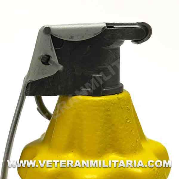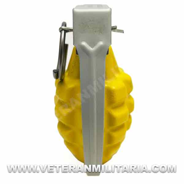 Reproducción de granada MK2 estadounidense de la segunda guerra mundial, el cuerpo es de resina en color amarillo, la palanca de seguridad (cuchara) está hecha de metal exactamente igual que las originales, pasador con la anilla están hechos de metal, es desmontable, el cuerpo está vacío con posibilidad de rellenar.