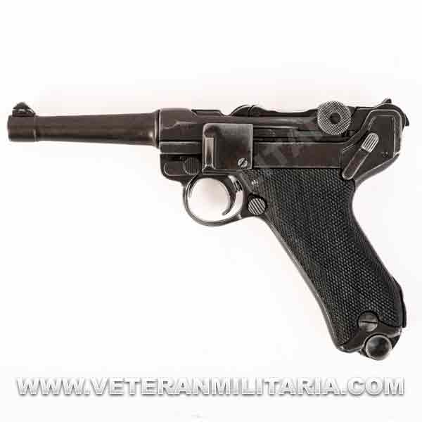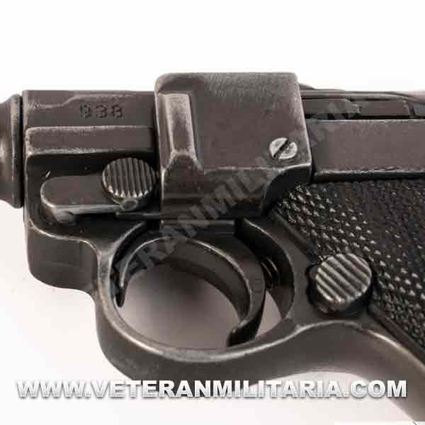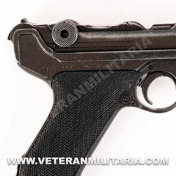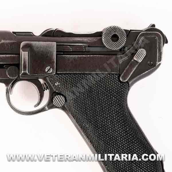 Reproducción a tamaño real de la Luger P08 utilizada por el ejército Alemán. Simula los movimientos de amartillamiento y disparo. Esta versión las partes metálicas están envejecidas, las cachas son de plástico negro.