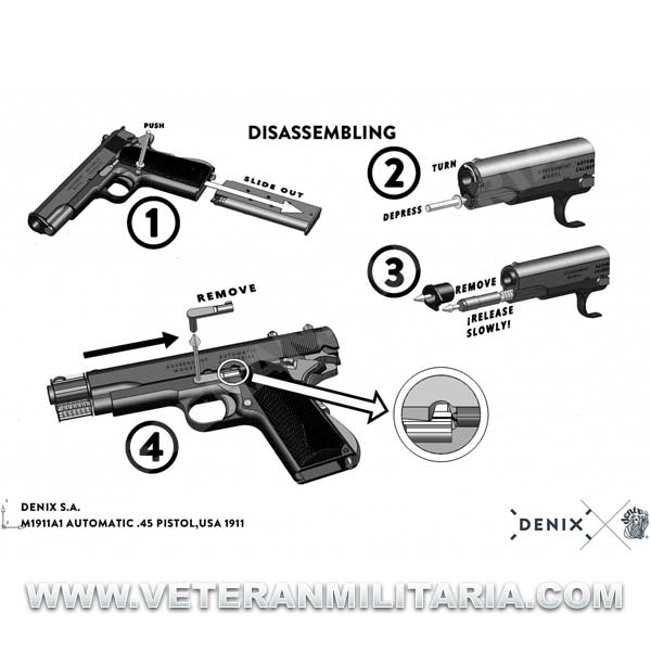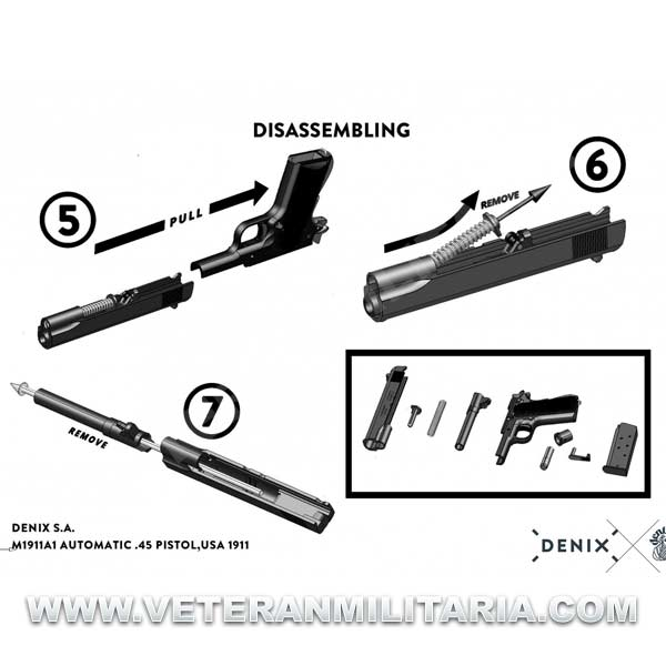 Reproducción a tamaño real de la pistola automática utilizada por el ejército de los Estados Unidos de América. con mecanismo simulador de carga y disparo, seguros móviles, cañón desmontable y cargador extraíble.