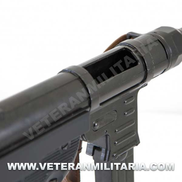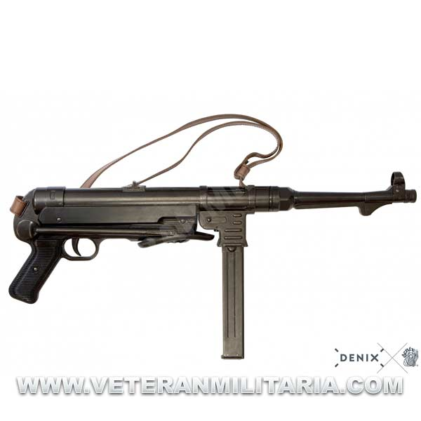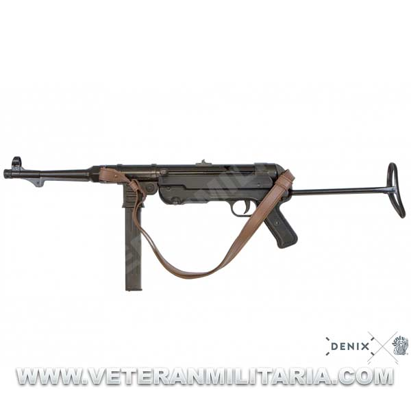 Reproducción a tamaño real de la subfusil MP40 utilizada por el ejercito Alemán. Fabricada en metal, las cachas y los laterales son de plástico, efectúa movimientos de amartillamiento y disparo, culata desplegable, cargador extraíble, con correa. Reproducción completamente incapacitada para el disparo real. Fabricado por Denix.